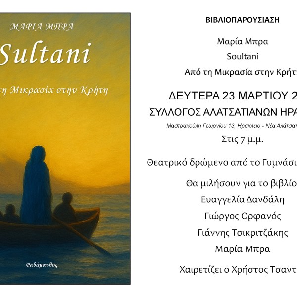 από Ραδάμανθυς - Εκδόσεις, Πολυχώρος, Εργαστήρια Δημοσιεύθηκε την 12/03/2026 Μαρία Μπρα «Sultani. Από τη Μικρασία στην Κρήτη» – Βιβλιοπαρουσίαση στα Χανιά Ανάγνωση του υπολοίπου