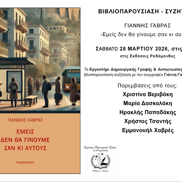 από Ραδάμανθυς - Εκδόσεις, Πολυχώρος, Εργαστήρια Δημοσιεύθηκε την 19/03/2026 Χανιά: Βιβλιοπαρουσίαση Γιάννης Γαβράς «Εμείς δεν θα γίνουμε σαν κι αυτούς» Ανάγνωση του υπολοίπου