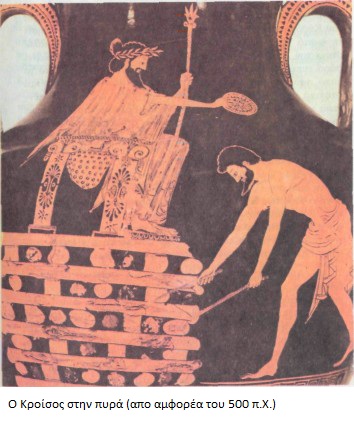 86. Κυρίεψαν (Το 546 π.Χ.) λοιπόν οι Πέρσες τις Σάρδεις κι έπιασαν τον Κροίσο ζωντανό, αφού βασίλεψε δεκατέσσερα χρόνια, πολιορκήθηκε δεκατέσσερις μέρες κι έβαλε τέλος στη δική του μεγάλη αρχή σύμφωνα με το χρησμό. Τον πήραν και τον πήγαν στον Κύρο. Αυτός έβαλε κι έστησαν μεγάλη φωτιά κι ανέβασε επάνω τον Κροίσο δεμένο και δεκατέσσερις νέους μαζί τον. Ο σκοπός του ήταν είτε να τους προσφέρει σε κάποια θεότητα σαν διαλεχτή θυσία, είτε γιατί ήθελε να κάνει προσευχή είτε ακόμα και γιατί ακούγοντας πως ο Κροίσος ήταν θεοσεβής τον ανέβασε στη φωτιά για να δει αν θα τον έσωζε κάποιος θεός, ώστε να μην καεί ζωντανός. Αυτά λοιπόν έκανε. Ο Κροίσος τώρα ανεβασμένος πάνω στη φωτιά, ενώ βρισκόταν σε τόσο μεγάλη δυστυχία, θυμήθηκε τα λόγια του Σόλωνα, πόσο ήταν ειπωμένα με έμπνευση θεού, ότι «κανένας από όσους ζουν δεν είναι ευτυχισμένος». Όταν λοιπόν ήρθε στο νου του αυτό το πράγμα, ενώ ήταν σιωπηλός, αναστέναξε βαθιά και είπε τρεις φορές τ’ όνομα του Σόλωνα. Όταν τ’ άκουσε ο Κύρος, έβαλε τους διερμηνείς να ρωτήσουν τον Κροίσο ποιος ήταν αυτός που φώναζε κι αυτοί πήγαν κοντά του και του έκαναν την ερώτηση. Ο Κροίσος όταν τον ρώτησαν στην αρχή σώπαινε, ύστερα όμως όταν τον πίεσαν, είπε• «Είναι αυτός, που εγώ θα προτιμούσα να μιλούσαν μαζί του οι βασιλιάδες παρά να έχουν πολλά χρήματα». Αυτά όμως δεν είχαν γι’ αυτούς νόημα και τον ξαναρώτησαν τι εννοούσε. Επειδή όμως επέμεναν και τον ενοχλούσαν, τους λέει ότι παλιά κάποτε τον επισκέφτηκε ο Σόλων, που ήταν Αθηναίος, και αφού είδε όλα τα καλά του τα περιφρόνησε• του είπε λόγια τέτοια που βγήκαν όλα έτσι ακριβώς που τα είχε πει. Και δεν τα έλεγε μόνο για εκείνον αλλά για κάθε άνθρωπο και μάλιστα γι’ αυτούς που έχουν την ιδέα πως είναι ευτυχισμένοι. Αυτά έλεγε ο Κροίσος κι η φωτιά ήταν αναμμένη κι έβγαζε φλόγες ολόγυρα. Και ο Κύρος όταν άκουσε από τους διερμηνείς αυτά που είπε ο Κροίσος, άλλαξε γνώμη. Σκέφτηκε ότι ενώ κι ο ίδιος ήταν άνθρωπος, πήγαινε να παραδώσει ζωντανό στη φωτιά έναν άλλο άνθρωπο, που δεν ήταν κατώτερος του στην ευτυχία. Εκτός απ’ αυτό, φοβήθηκε μήπως πληρώσει κι ο ίδιος. Τίποτα από τα ανθρώπινα δεν είναι ασφαλισμένο συλλογίστηκε και διάταξε να σβήσουν αμέσως τη φωτιά που άναβε και να κατεβάσουν τον Κροίσο και τους άλλους. Αυτοί παρά τις προσπάθειες τους δεν μπορούσαν πια να νικήσουν τη φωτιά.