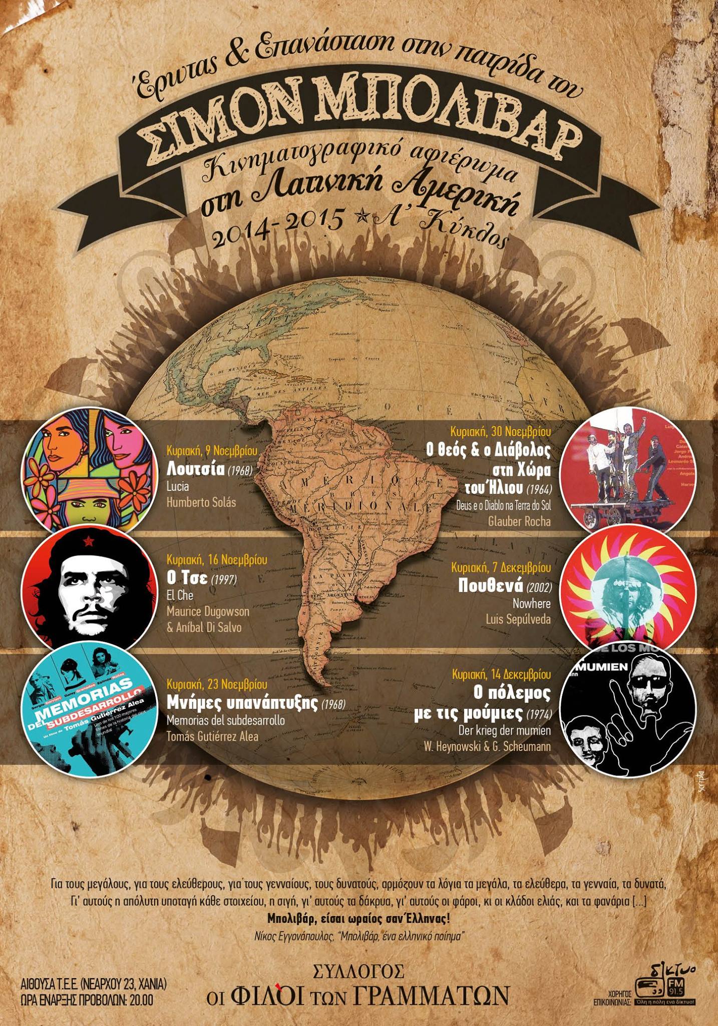 Οι έξι ταινίες που θα προβληθούν για πρώτη φορά στα Χανιά από τις αρχές Νοεμβρίου μέχρι τα μέσα Δεκεμβρίου στο πλαίσιο αυτού του αφιερώματος (τέσσερις μυθοπλασίας και δύο ντοκιμαντέρ) αφορούν στη Λατινική Αμερική, την ήπειρο με τις στυγνές δικτατορίες και τα αδιάκοπα στρατιωτικά πραξικοπήματα μα και με τις πλούσιες εθνικοαπελευθερωτικές, δημοκρατικές και επαναστατικές παραδόσεις, την πατρίδα του Σιμόν ντε Μπολιβάρ, του Εμιλιάνο Ζαπάτα και του Ερνέστο Τσε Γκεβάρα.