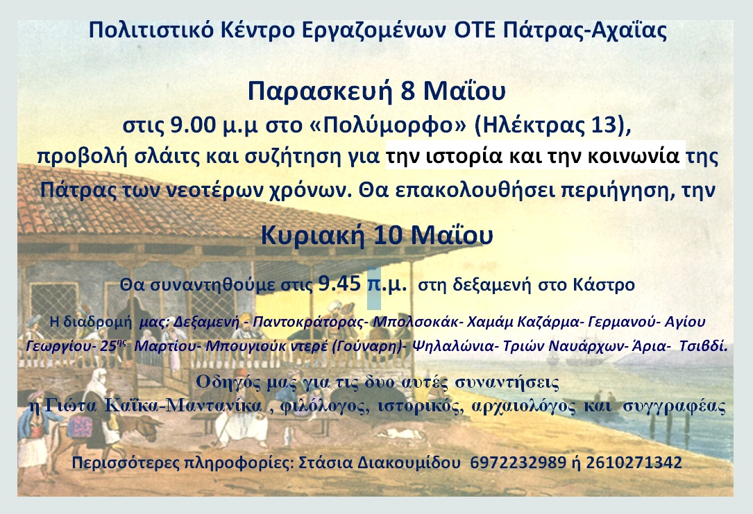 Με στόχο να γνωρίσουμε καλύτερα την πόλη μας, αλλά και ευρύτερα τον τόπο μας, συνεχίζουμε τις ενημερωτικές συναντήσεις στο «Πολύμορφο», το στέκι του Πολιτιστικού Κέντρου Εργαζομένων ΟΤΕ Πάτρας-Αχαΐας, Ηλέκτρας 13 (Τέρμα Κορίνθου στην παλιά λαχαναγορά).
