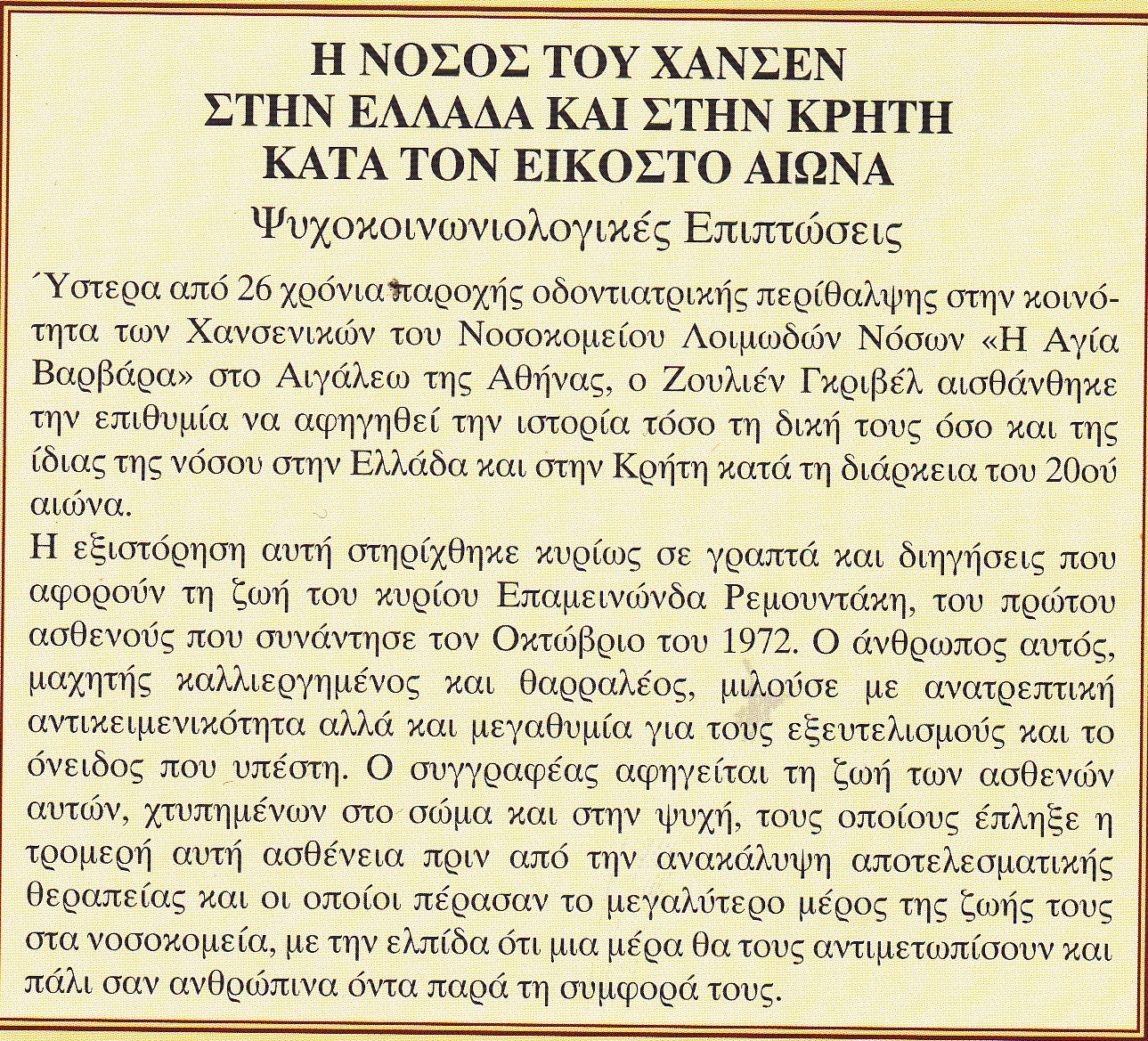Η εργασία αυτή αποσκοπεί στο να μοιραστώ την εμπειρία μου και να αναπλάσω την κοινωνική συμπεριφορά απέναντι στην ασθένεια στην Ελλάδα και ειδικότερα στην Κρήτη. Πέρα από τα ιατρικά ζητήματα, η νόσος του Χάνσεν μπορεί πράγματι να θεωρηθεί ως έννοια ψυχοκοινωνιολογική. Είναι γεγονός ότι η ενδημική της φύση αποκτά συχνά μεγάλη σημασία για τον ασθενή, την οικογένειά του, τους περίοικους του και τις υγειονομικές αρχές. Με το να την αγνοήσει κανείς, παραγνωρίζει όλες τις προσπάθειες που καταβλήθηκαν σε επίπεδο ιατρικό, διοικητικό και νομοθετικό προς όφελος του ατόμου και της κοινωνίας. Σε πολλές περιοχές ο «λεπρός» συνδέεται ακόμη με ιστορικά κλισέ, που εξακολουθούν να χαρακτηρίζονται από μια παραδοσιακή στάση απόρριψης, που συχνά εμπεριέχουν μια αίσθηση ενοχής και μια αντίληψη ότι πρόκειται για θεϊκή τιμωρία για αμαρτήματα που διαπράχθηκαν σ’ αυτή τη ζωή ή σε προηγούμενη. Η εργασία αυτή στηρίχθηκε κυρίως στην ανέκδοτη αυτοβιογραφία του Κυρίου Επαμεινώνδα Ρεμουντάκη, στην οποία αφηγείται τη δική του εκδοχή γι’ αυτή την τρομερή ασθένεια, καθώς και στο βιβλίο του Μωρίς Μπορν με τίτλο «Η Μολυσματική Χίμαιρα».