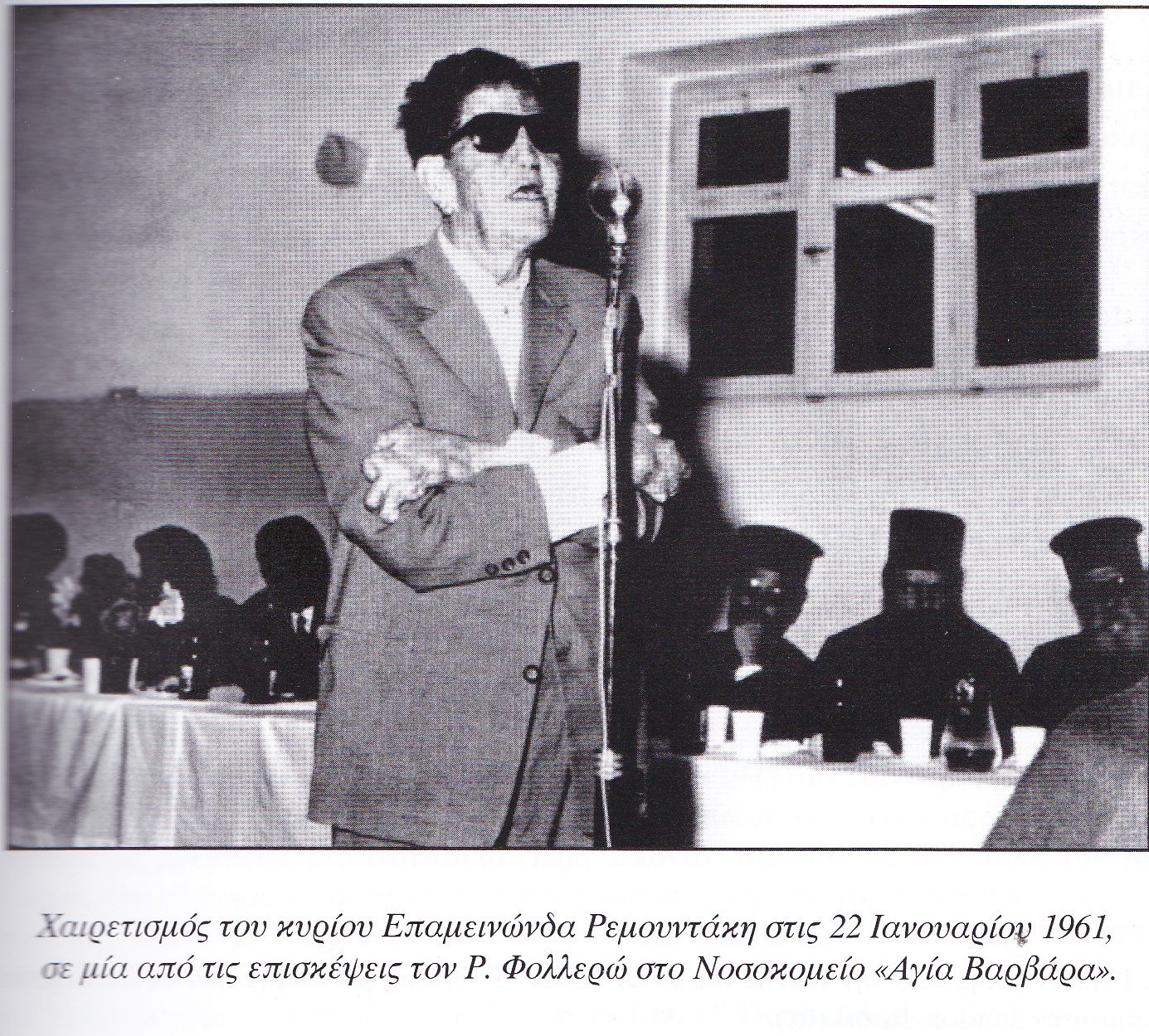 Χαιρετισμός του κυρίου Επαμεινώνδα Ρεμουντάκη στις 22 Ιανουαρίου 1961, σε μία από τις επισκέψεις του Ρ. Φολλερώ* στο Νοσοκομείο «Αγία Βαρβάρα».