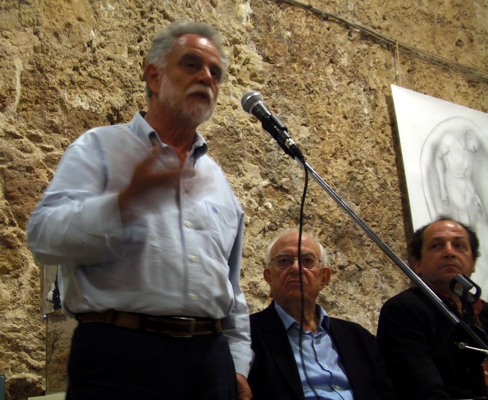 Ο Σάκης Ροδίτης στην παρουσίαση του βιβλίου στα Χανιά. Δεξιά του διακρίνονται οι: Σήφης Μιχελογιάννης και Δημήτρης δαμασκηνός, ομιλητές στην εκδήλωση που έγινε στον Ιστισοπλοϊκό Όμιλο Χανίων-Νεώριο Μόρο, σε κοινή διοργάνωση με το παράρτημα Χανίων της Μαθηματικής Εταιρείας, τις Εκδόσεις Ραδάμανθυς, την Επιτροπή Χανίων της Διεθνούς Εταιρείας Φίλων Νίκου Καζαντζάκη και το εργαστήρι οργανοποιίας του Αν. Ποταμίτη.