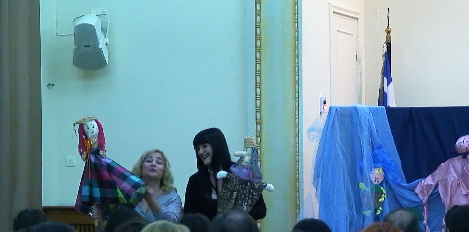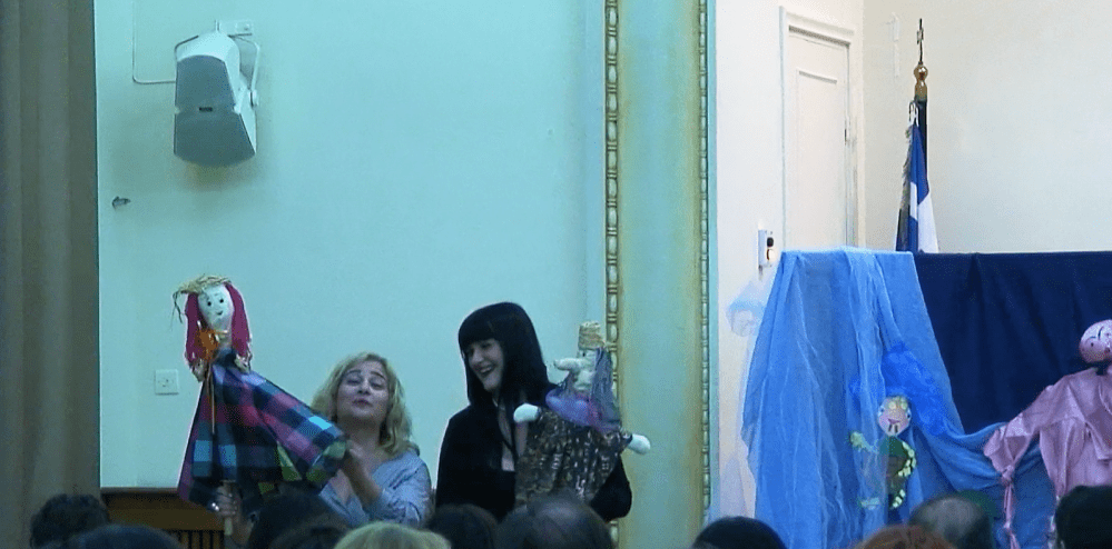 Η Ψήνια Ανδριάννα και η Μάρθα Βασκαντήρα, μετά από την παράσταση κουκλοθέατρου για το παραμύθι «Τα αντιεφιαλτικά σεντόνια της θάλασσας»