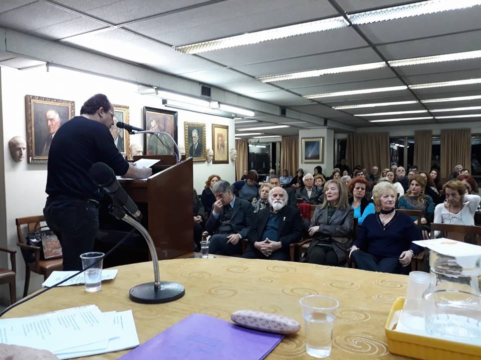 Ο Δημήτρης Δαμασκηνός στο βήμα της εκδήλωσης για την παρουσίαση του βιβλίου στην αίθουσα της Εταιρείας Ελλήνων Λογοτεχνών.