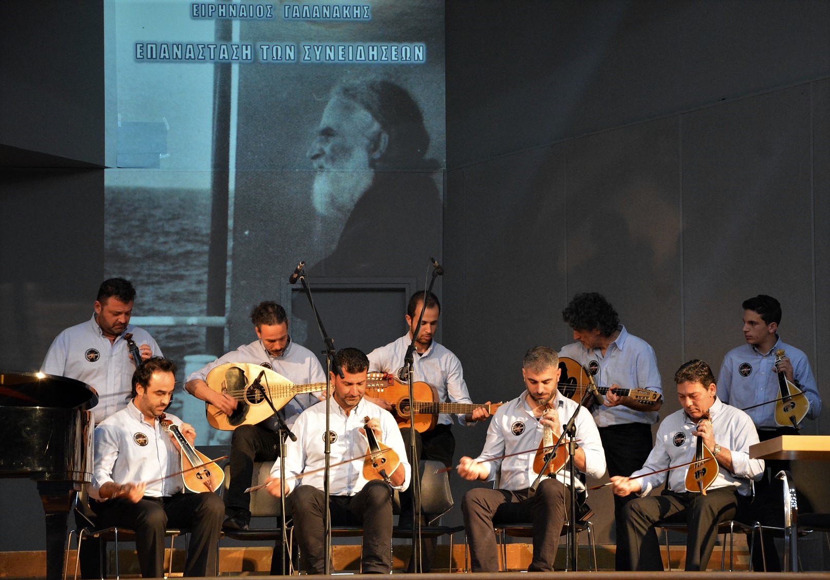 Φωτογραφία από την πρώτη παρουσίαση του βιβλίου στο Πνευματικό Κέντρο Χανίων, με τον παραδοσιακό μουσικό σύλλογο Αποκορώνου «Ο Χαρίλαος» να μελοποιεί στίχους του Ειρηναίου Γαλανάκη