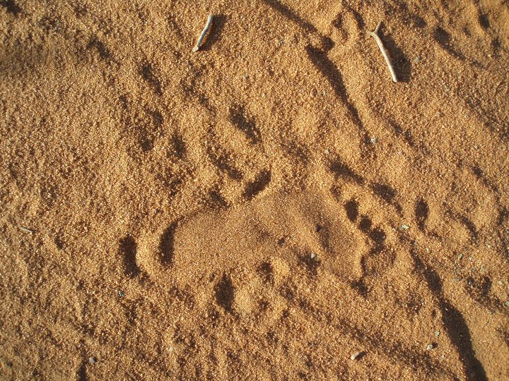 Γύρω μου αντιλαμβάνομαι εκατοντάδες ίσως χιλιάδες ίχνη. Πάνω στο κατακόκκινο χώμα αποτυπώματα από γυμνές πατούσες. Άλλα απ’ αυτά φρέσκα, θα πέρασαν οι ξυπόλητοι ήρωές μου πριν λίγο πιθανόν, άλλες πιο αχνές, άλλες μακρόστενες και ισχνές, άλλες μικρότερες, άλλες σχεδόν μικροσκοπικές. Κάθε ηλικίας και φύλου ίχνη στην πιο συγκλονιστική «ζωγραφιά» που είδα ποτέ στη ζωή μου. Σε καμιά πινακοθήκη, σε κανένα εκθεσιακό κέντρο, σε κανένα μουσείο δεν θα μπορούσα να δω ένα τέτοιο σπάνιο ανθρώπινο μνημείο!