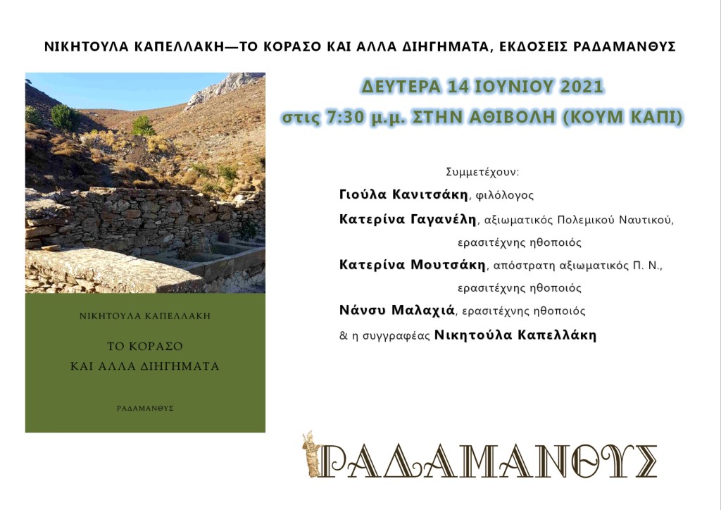 Οι Εκδόσεις Ραδάμανθυς παρουσιάζουν το βιβλίο της Νικητούλα Καπελλάκη «Το Κοράσο και άλλα Διηγήματα», την Δευτέρα 14/6/2021, στις 7:30 το απόγευμα στο μουσικό καφενείο Αθιβολή (Κουμ Καπί).