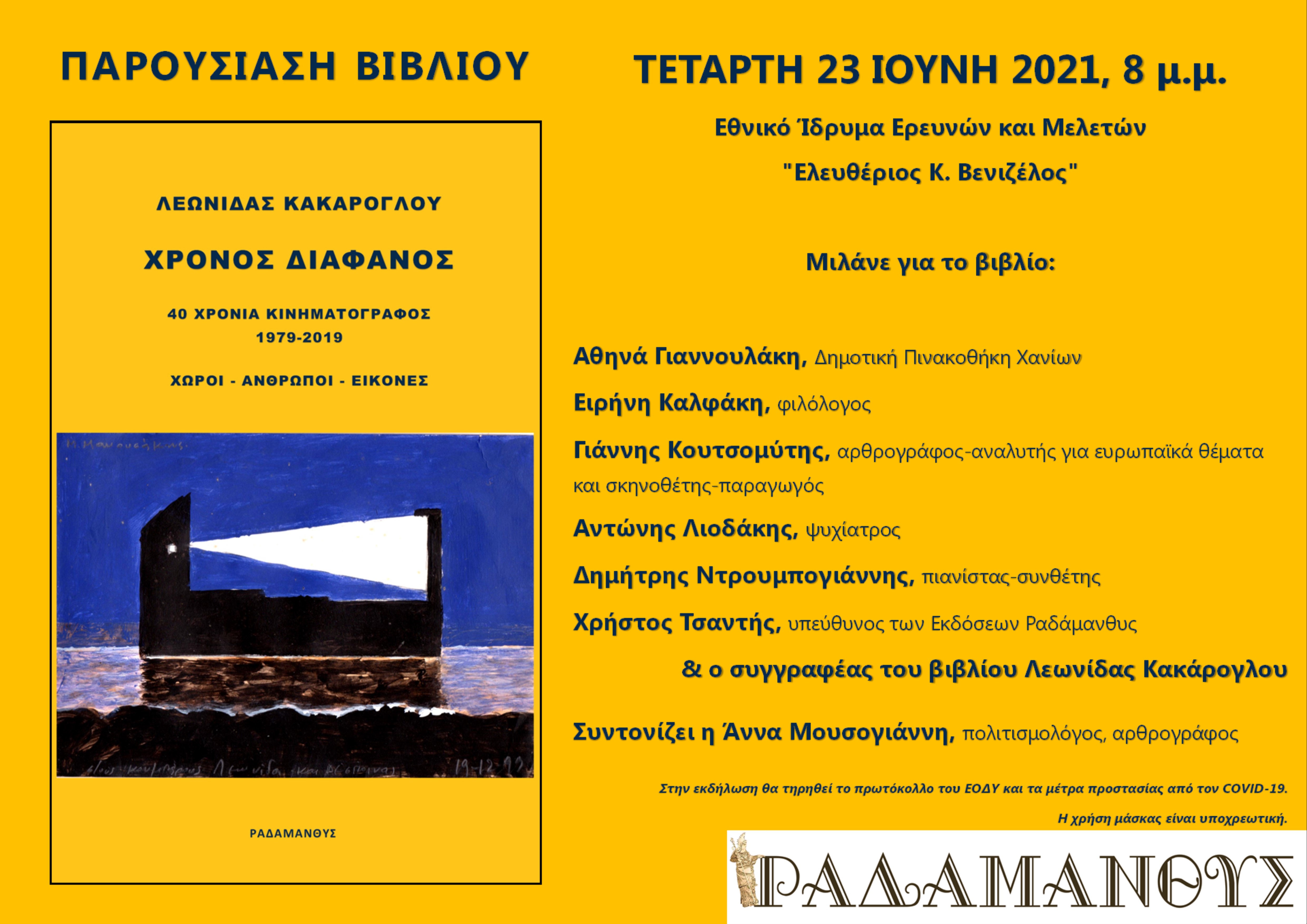 Την παρουσίαση του βιβλίου διοργανώνουν οι Εκδόσεις Ραδάμανθυς, με την υποστήριξη του Εθνικού Ιδρύματος Ερευνών και Μελετών «Ελευθέριος Κ. Βενιζέλος», στην αυλή του ιδρύματος, στην πλατεία Έλενας Βενιζέλου, την Τετάρτη 23 Ιούνη 2021, στις 8 το απόγευμα.
