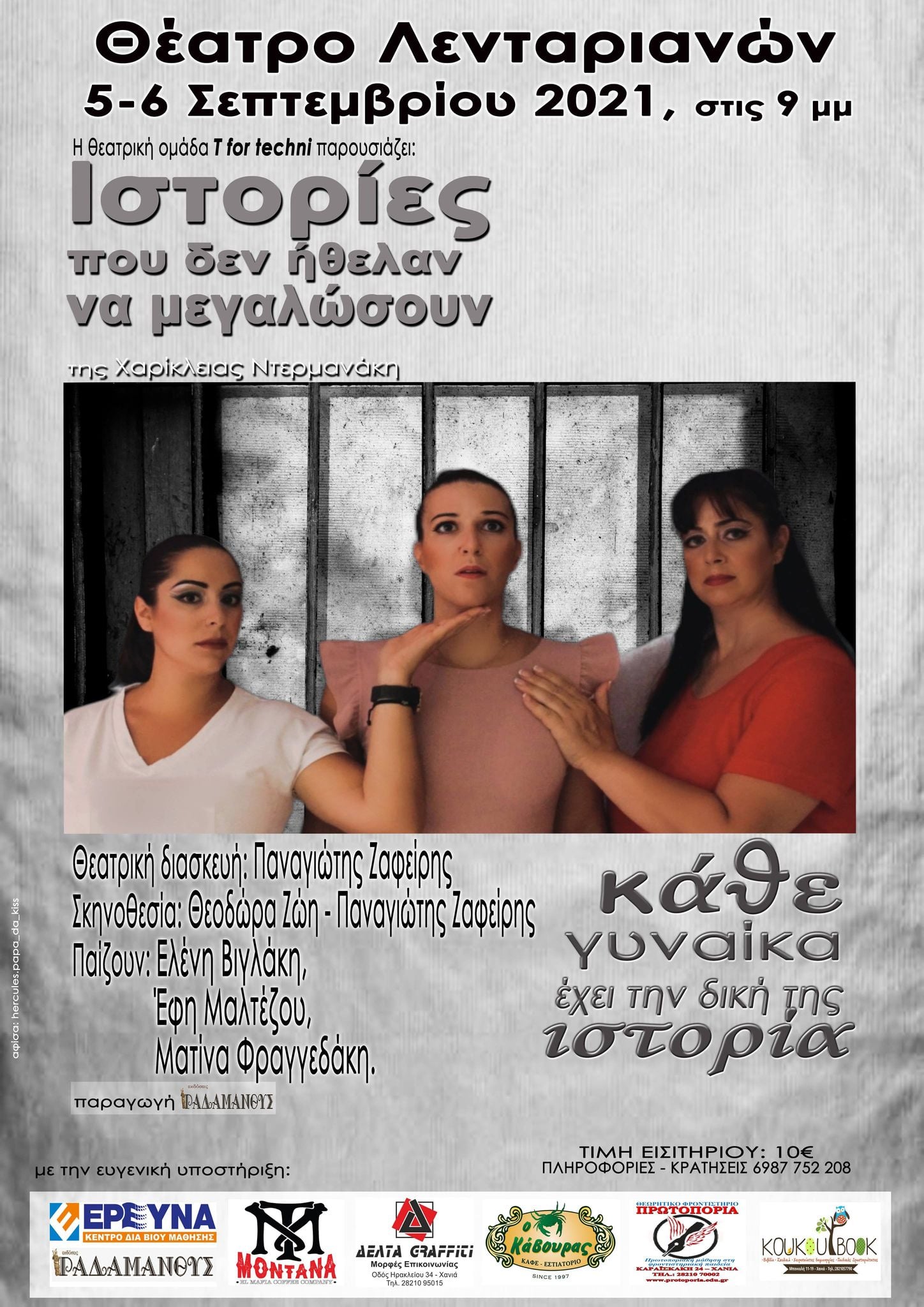 Αρχικά, να σημειώσουμε πως πρόκειται για τη θεατρική διασκευή του ομότιτλου βιβλίου της Χαρίκλειας Ντερμανάκη, την οποία επιμελήθηκε ο Παναγιώτης Ζαφείρης. Είναι ένα έργο πολύ επίκαιρο, αφού παρουσιάζει τις ιστορίες γυναικών της διπλανής πόρτας, φανερώνοντας τον τρόπο και το μέγεθος με το οποίο οι κοινωνικές αντιλήψεις περί του φύλου τους αποτυπώθηκαν επάνω τους και τελικά δρομολόγησαν τη ζωή τους. Συνοδοιπόροι των ιστοριών στέκονται η λογική και το συναίσθημα που παίρνουν θέση, αλληλοσυμπληρώνονται κι αντιμάχονται σε μια αέναη μάχη στον χρόνο.