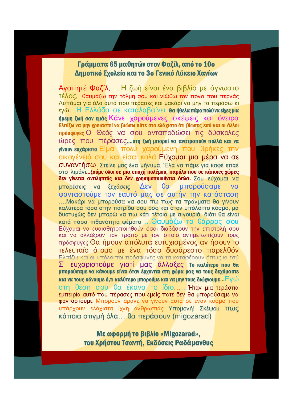 Η περιπέτεια του μικρού Φαζίλ, διαβάστηκε από πολλούς μαθητές σχολείων των Χανίων. Περισσότεροι από 200 μαθητές αποφάσισαν να στείλουν ένα μήνυμα στον Φαζίλ, κατά τη διάρκεια των συναντήσεων που είχε ο συγγραφέας μαζί τους. Μαθητές από το 3ο Γενικό Λύκειο, το 10ο Δημοτικό Σχολείο, το 11ο και το 19ο Δημοτικό Σχολείο Χανίων, καθώς από τα Πουλιά, τους Οδηγούς και τους Μεγάλους Οδηγούς του Τοπικού Τμήματος Χανίων του Σώματος Ελληνικού Οδηγισμού. Τα γράμματα των παιδιών με ευαισθησία και με ωριμότητα, συγκλονίζουν.