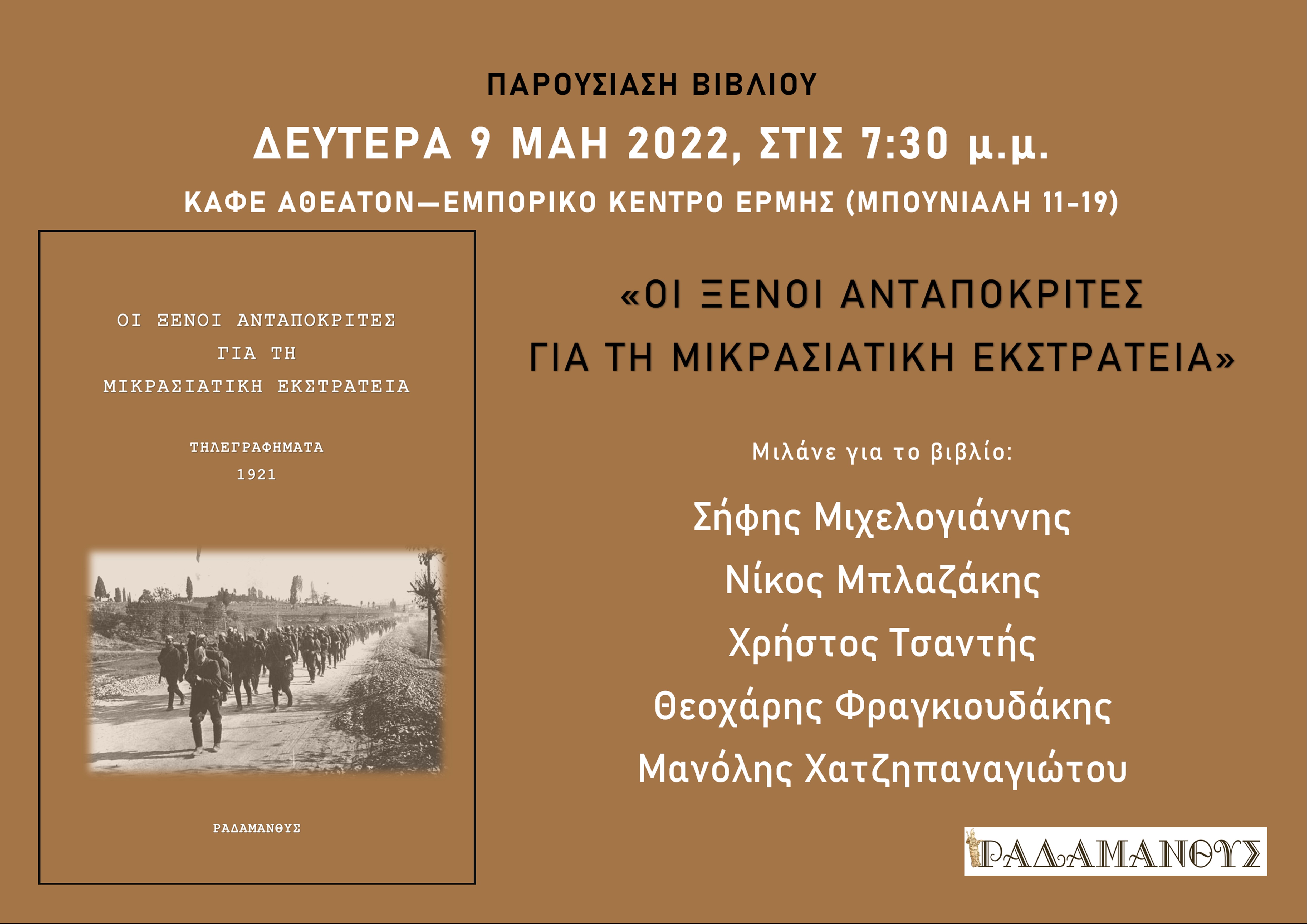 Οι Εκδόσεις Ραδάμανθυς παρουσιάζουν ένα σπάνιο βιβλίο-ντοκουμέντο, με τίτλο «ΟΙ ΞΕΝΟΙ ΑΝΤΑΠΟΚΡΙΤΕΣ ΓΙΑ ΤΗ ΜΙΚΡΑΣΙΑΤΙΚΗ ΕΚΣΤΡΑΤΕΙΑ».