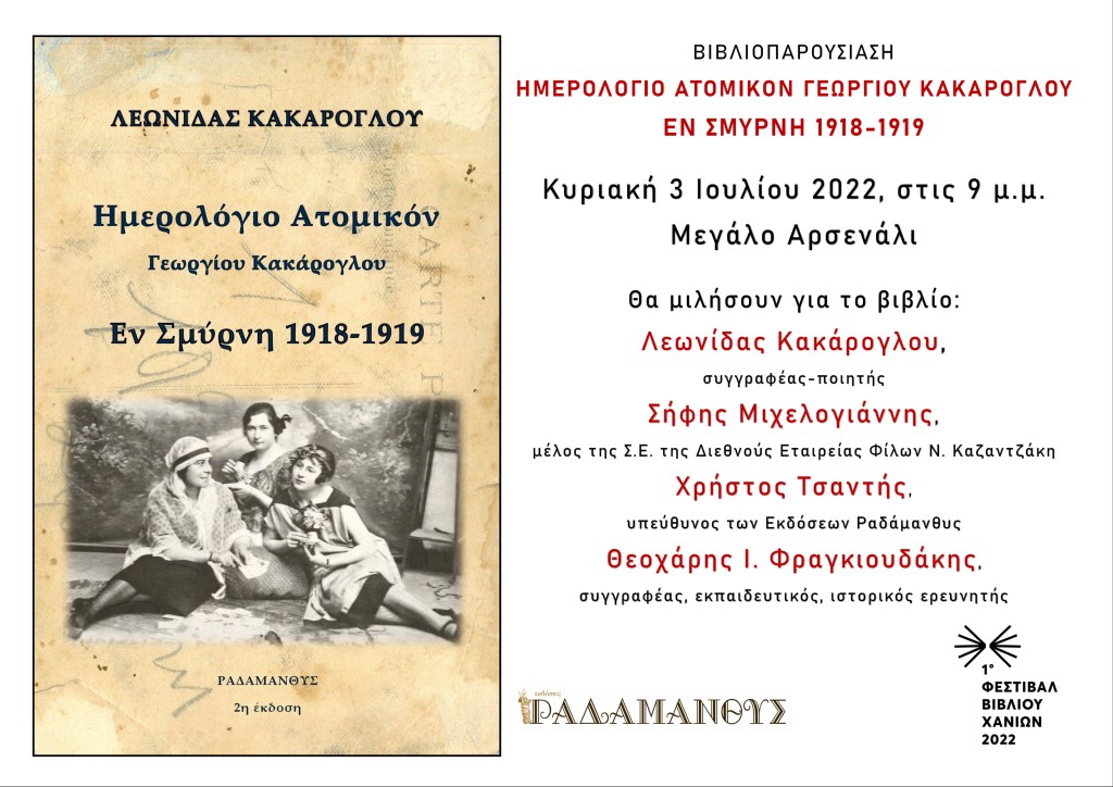 Οι Εκδόσεις Ραδάμανθυς παρουσιάζουν τη 2η έκδοση του βιβλίου «Ημερολόγιο Ατομικόν Γεωργίου Κακάρογλου – Εν Σμύρνη 1918-1919», του Λεωνίδα Κακάρογλου. Η παρουσίαση του βιβλίου θα γίνει την Κυριακή 3/7/2022, στις 9 το βράδυ, στο Μεγάλο Αρσενάλι στο Ενετικό Λιμάνι.