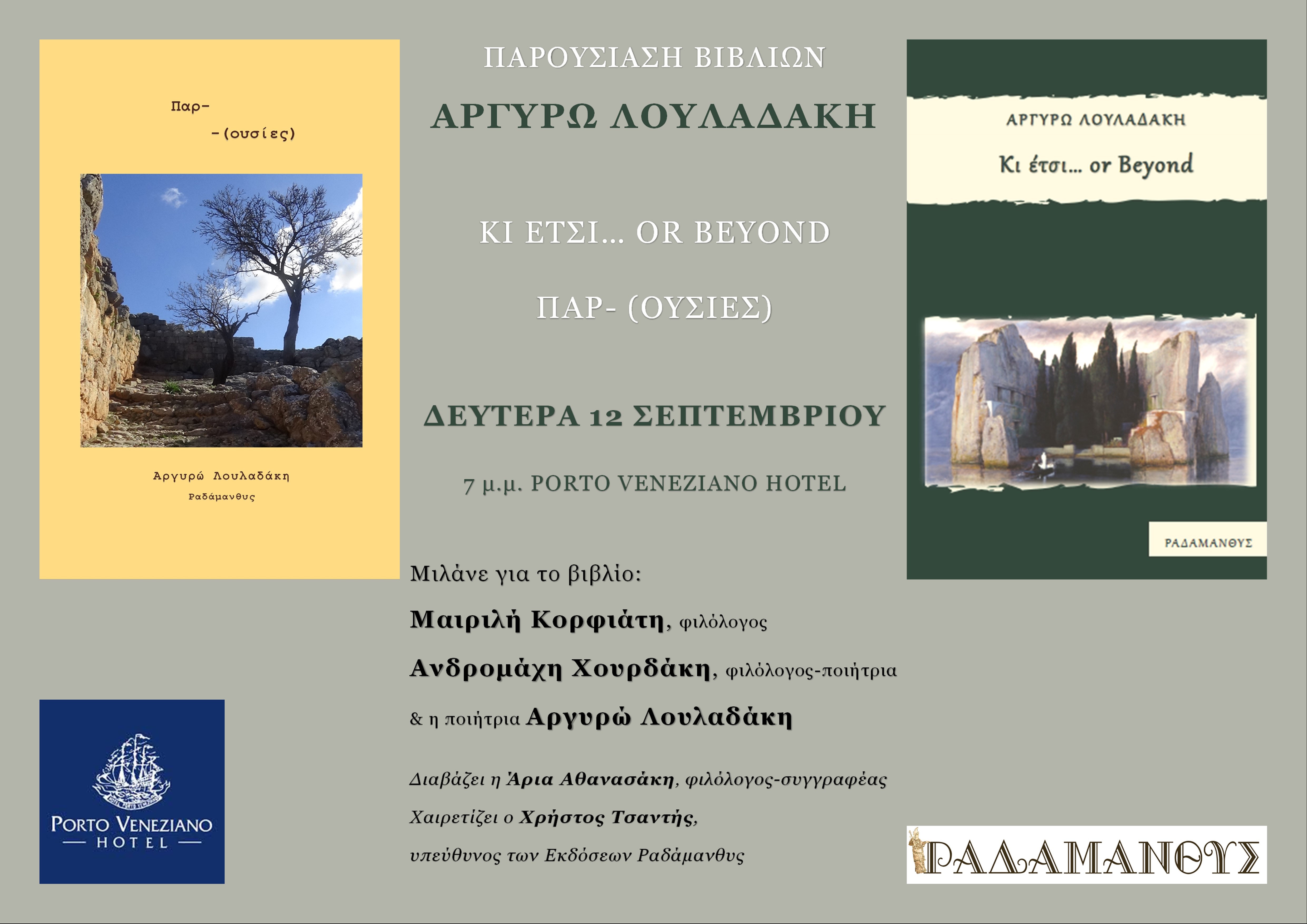 Οι Εκδόσεις Ραδάμανθυς παρουσιάζουν τις ποιητικές συλλογές της Αργυρώς Λουλαδάκη «ΚΙ ΕΤΣΙ… OR BEYOND» & «ΠΑΡ- (ΟΥΣΙΕΣ)», τη Δευτέρα 12 Σεπτεμβρίου 2022, στον κήπο του Porto Veneziano Hotel στο Ενετικό Λιμάνι των Χανίων.
