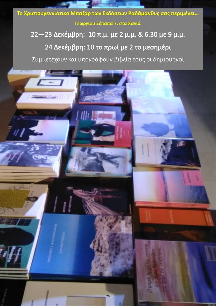 Οι Εκδόσεις Ραδάμανθυς προσφέρουν ποιοτικά βιβλία σε πολύ χαμηλές τιμές στο καθιερωμένο χριστουγεννιάτικο μπαζάρ. Συμμετέχουν πολλοί δημιουργοί που θα υπογράφουν τα βιβλία τους. Στον Πολυχώρο Ραδάμανθυς (Ξέπαπα 7) στα Χανιά.