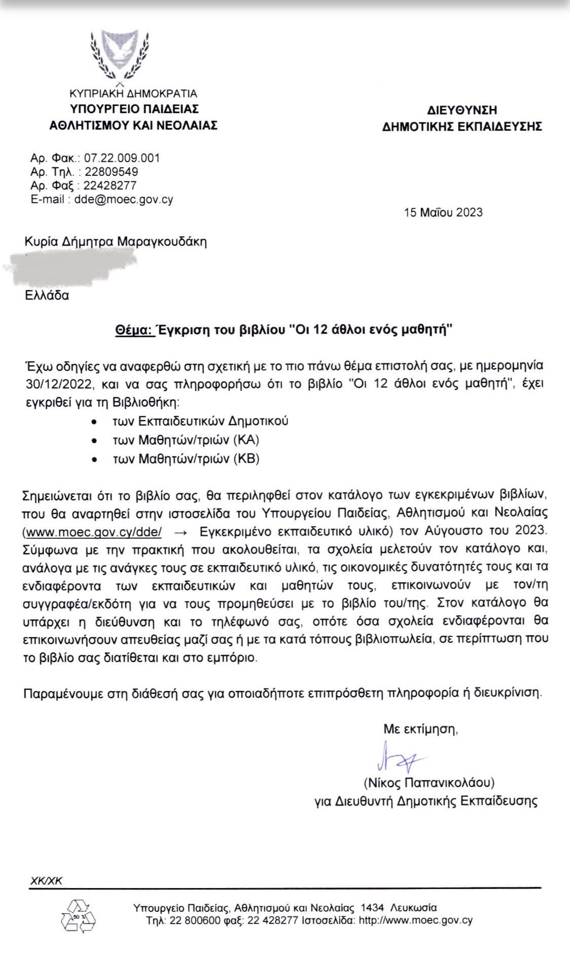 Σημαντική διάκριση για τη Χανιώτισσα παιδαγωγό Δήμητρα Μαραγκουδάκη αποτελεί η έγκριση του βιβλίου της «Οι 12 άθλοι ενός μαθητή» από το υπουργείο Παιδείας, Αθλητισμού και Νεολαίας, έτσι ώστε να αξιοποιηθεί στα Δημοτικά Σχολεία της Κυπριακής Δημοκρατίας.