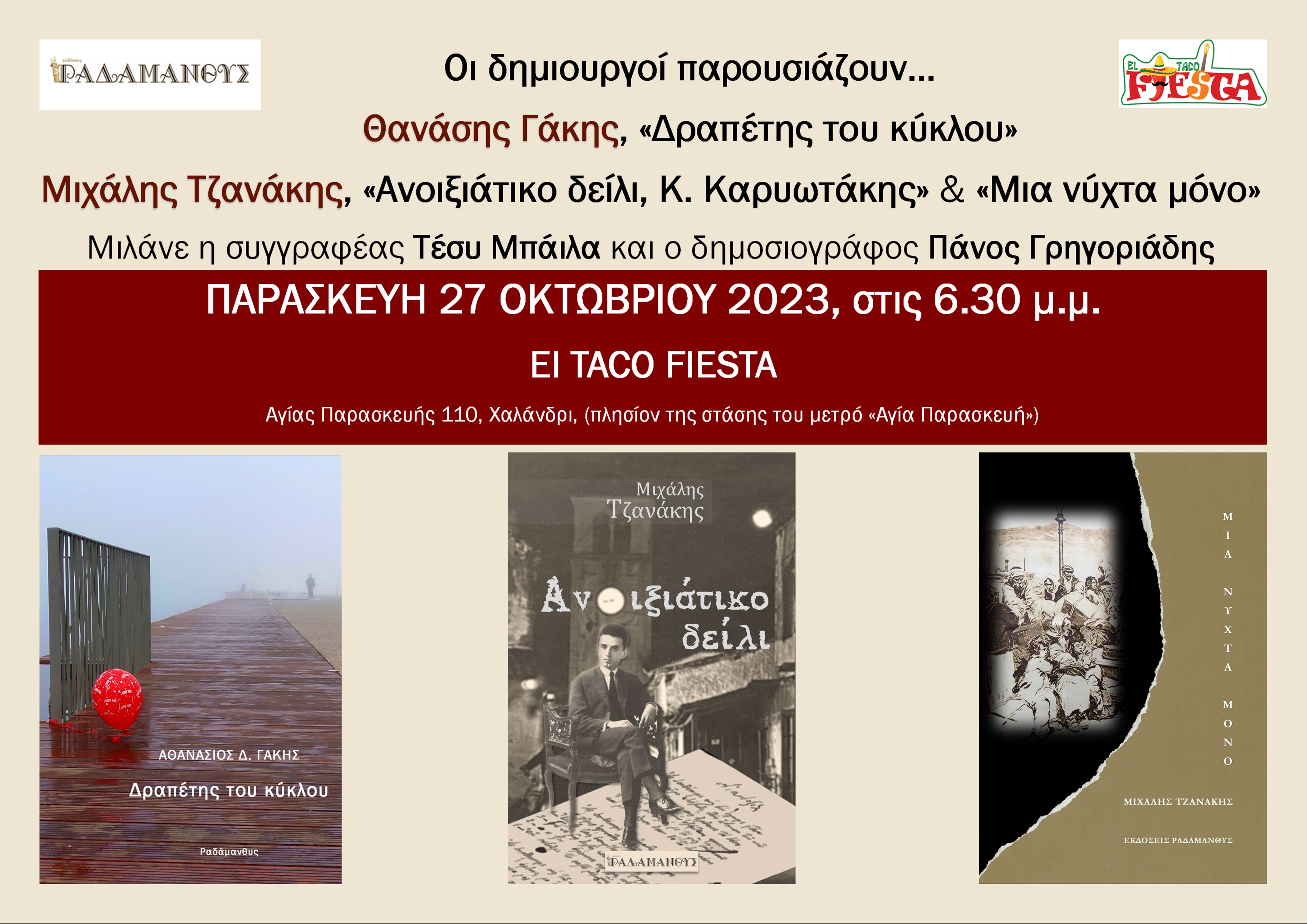 Στο πλαίσιο των εκδηλώσεων με τίτλο «Οι Δημιουργοί παρουσιάζουν», οι Εκδόσεις Ραδάμανθυς παρουσιάζουν τους συγγραφείς Θανάση Γάκη και Μιχάλη Τζανάκη. Μιλάνε η συγγραφέας Τέσυ Μπάιλα και ο δημοσιογράφος Πάνος Γρηγοριάδης. Η εκδήλωση θα γίνει την Παρασκευή 27 Οκτωβρίου 2023, στις 6.30 το απόγευμα στο El Taco fiesta (Αγίας Παρασκευής 110, Χαλάνδρι – κοντά στο μετρό «Αγία Παρασκευή).