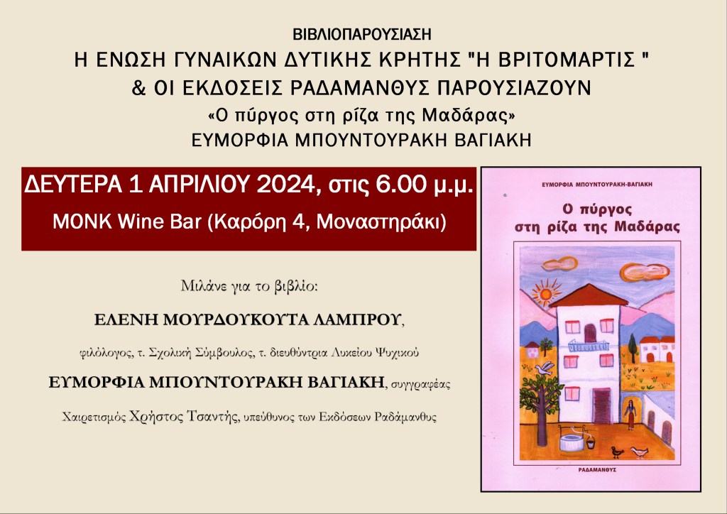 Η Ένωση Γυναικών Δυτικής Κρήτης «Η ΒΡΙΤΟΜΑΡΤΙΣ» & οι Εκδόσεις Ραδάμανθυς παρουσιάζουν το βιβλίο «Ο πύργος στη ρίζα της Μαδάρας», της Ευμορφίας Μπουντουράκη Βαγιάκη, τη Δευτέρα 1 Απριλίου 2024, στις 6 μ.μ. στο MONK WINE BAR (Καρόρη 4, στο Μοναστηράκι).