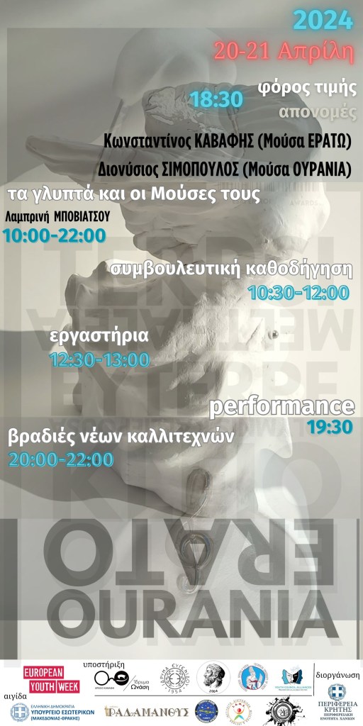 Η ΕΣΑΕΙ ΕΝ ΡΟΗ με τις Εκδόσεις ΡΑΔΑΜΑΝΘΥΣ σε συνδιοργάνωση με την Περιφερειακή Ενότητα Χανίων, καθώς και με την υποστήριξη του Ινστιτούτου Διατροφικών Μελετών και Ερευνών και στο πλαίσιο εορτασμού της Ευρωπαϊκής Εβδομάδας ΝΕΟΛΑΙΑΣ σας προσκαλούν Σάββατο και Κυριακή, 20-21 Απρίλη, 18:30 – 22:00 στο Πνευματικό Κέντρο Χανίων σε βραδιές αφιερωμένες στον Κωνσταντίνο Καβάφη και τον Διονύσιο Σιμόπουλο, αποδίδοντας φόρο τιμής στο έργο τους. Οι δράσεις καλλιτεχνικής παιδείας ΜΟΥΣΩΝ ΚΑΙΝΟΠΡΑΓΙΑ εξυπηρετούν στην ανάπτυξη, διάδοση και προώθηση της καινοτομίας των Καλών Τεχνών με αγωγούς, πομπούς και δέκτες την ακμάζουσα ΝΕΟΛΑΙΑ μας και γενικότερα τη Νέα μας Γενιά. Επίσης, συμβάλλουν στην ευαισθητοποίηση των πολιτών και επιμόρφωσής τους.Κύριο μέλημα είναι η εντρύφηση των νέων και της εκπαιδευτικής κοινότητας σε θέματα που όπως κάθε χρόνο, αφορούν:• την τοπική ιστορία των παραστατικών, οπτικοακουστικών και εικαστικών τεχνών, αλλά και ευρύτερα, στην Ελλάδα,• την ανάπτυξη αισθητικής αγωγής στις παραστατικές τέχνες και• την υποστήριξη σε διαδικασίες επαγγελματικού προσανατολισμού και συμβουλευτικής καθοδήγησης νεαρών ατόμων με καλλιτεχνικά ενδιαφέροντα ή ιδιαίτερες κλίσεις στις καλές τέχνες.