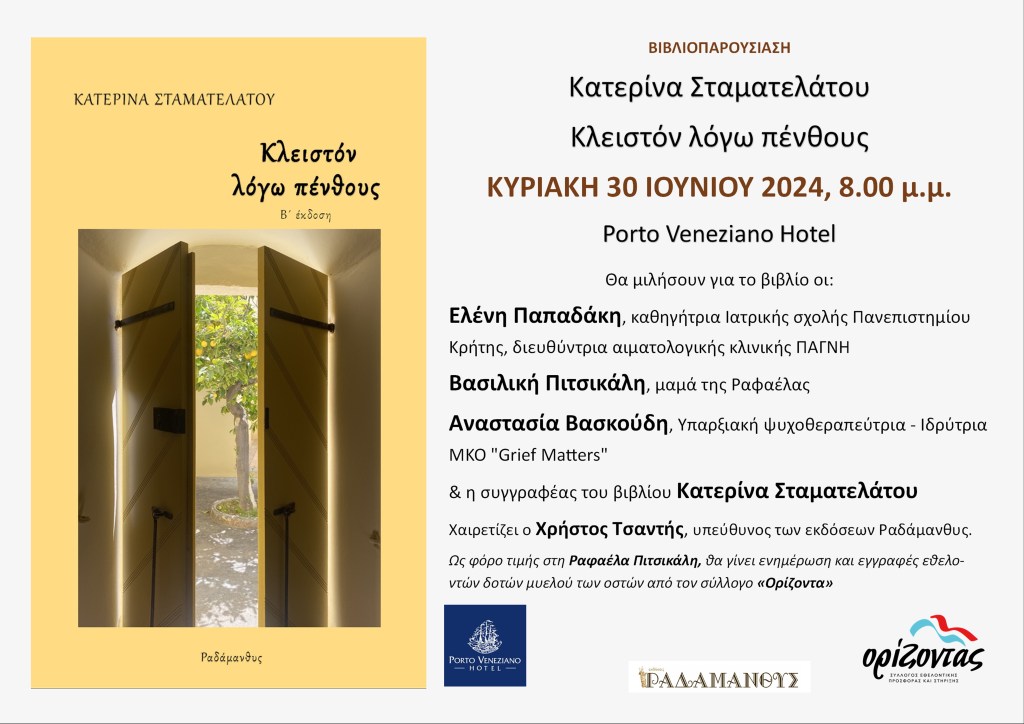 Οι Εκδόσεις Ραδάμανθυς σας προσκαλούν στην παρουσίαση του βιβλίου της Κατερίνας Σταματελάτου «Κλειστόν λόγω πένθους», την Κυριακή 30 Ιουνίου 2024, στις 8.00 το απόγευμα, στο ξενοδοχείο Porto Veneziano, στο Ενετικό Λιμάνι των Χανίων.