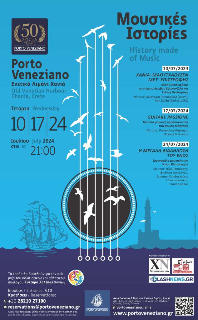 Μια μοναδική Τριλογία πολιτιστικών εκδηλώσεων θα πραγματοποιηθεί και φέτος το καλοκαίρι στην πόλη μας, με τίτλο «Μουσικές Ιστορίες – 50 Χρόνια Μετά», στο φιλόξενο αίθριο του ξενοδοχείου Porto Veneziano, στο Ενετικό λιμάνι. Είναι προγραμματισμένες να ταξιδέψουν το κοινό τους με τα φτερά της αυθεντικής καλλιτεχνικής δημιουργίας, τις Τετάρτες 10, 17 και 24 Ιουλίου, στις 9.00 μ.μ.