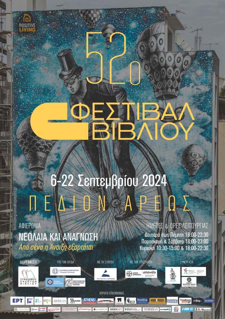 Στις 6 Σεπτεμβρίου, η μεγαλύτερη γιορτή του Βιβλίου «ανοίγει τις πύλες της» στο Πεδίον του Άρεως για να υποδεχτεί τους φίλους του βιβλίου και να προσελκύσει νέους αναγνώστες. 200 εκδοτικοί οίκοι, 280 περίπτερα, 200 πολιτιστικές εκδηλώσεις, συναυλίες, θεατρικές παραστάσεις, διαδραστικά εκπαιδευτικά δρώμενα και πολλά άλλα στο μεγάλο 52ο Φεστιβάλ Βιβλίου 2024.