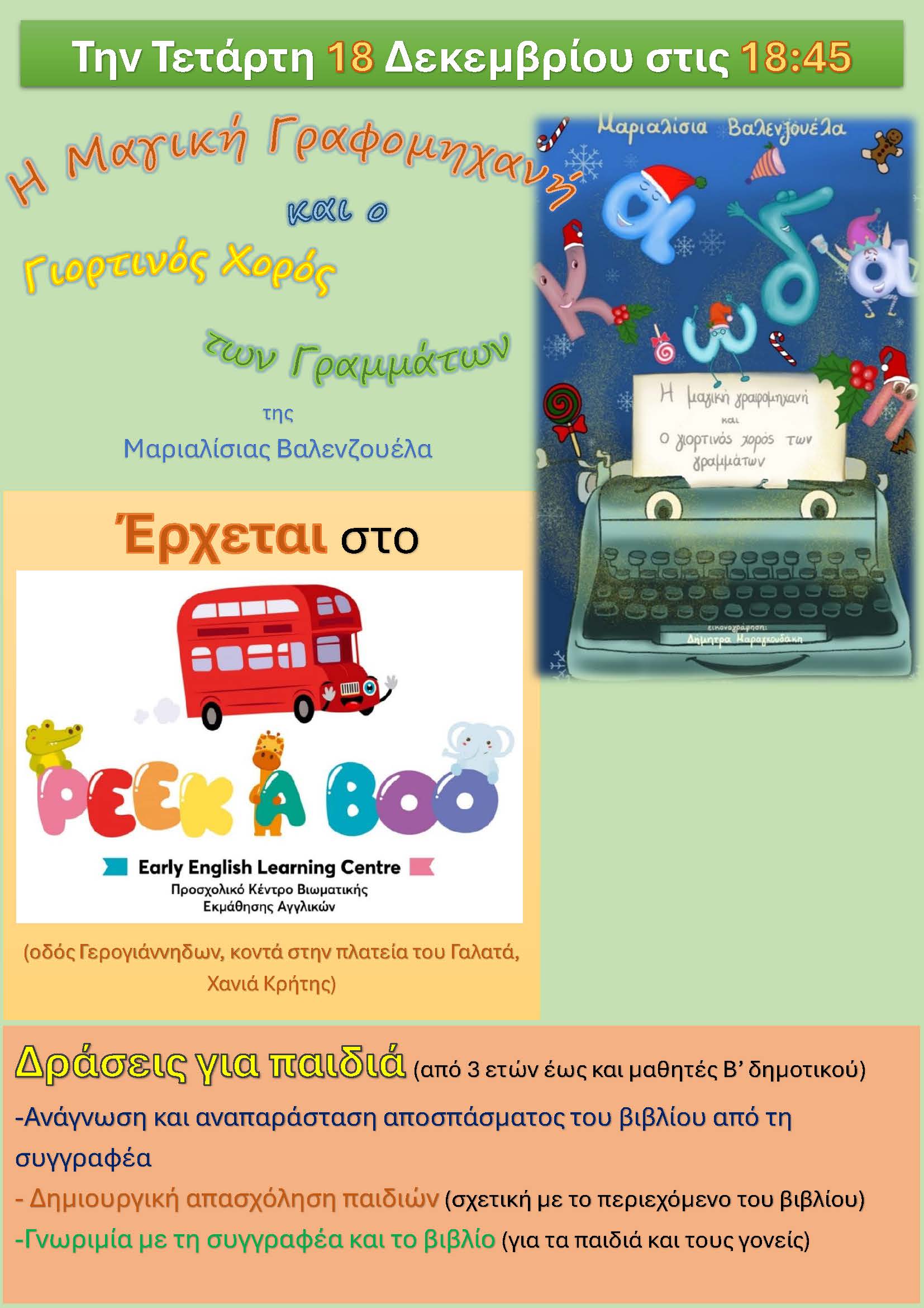 Τετάρτη 18 Δεκεμβρίου, στις 6.45 μ.μ., στο Προσχολικό Κέντρο Βιωματικής Εκμάθησης Αγγλικών PEEK A BOO (οδός Γερογιάννηδων, κοντά στην πλατεία του Γαλατά)