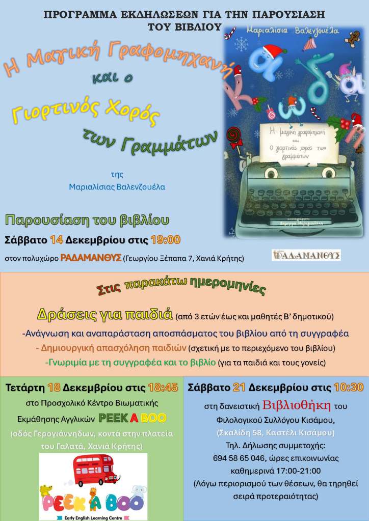 Θα ακολουθήσουν δράσεις για παιδιά (από 3 ετών έως και μαθητές Β’ δημοτικού), την Τετάρτη 18 Δεκεμβρίου, στις 6.45 μ.μ., στο Προσχολικό Κέντρο Βιωματικής Εκμάθησης Αγγλικών PEEK A BOO (οδός Γερογιάννηδων, κοντά στην πλατεία του Γαλατά) και το Σάββατο 21 Δεκεμβρίου, στις 10:30 π.μ., στη δανειστική Βιβλιοθήκη του Φιλολογικού Συλλόγου Κισάμου (Σκαλίδη 58, Καστέλι Κισάμου), με ανάγνωση και αναπαράσταση αποσπάσματος του βιβλίου από τη συγγραφέα, δημιουργική απασχόληση παιδιών (σχετική με το περιεχόμενο του βιβλίου), γνωριμία με τη συγγραφέα και το βιβλίο.