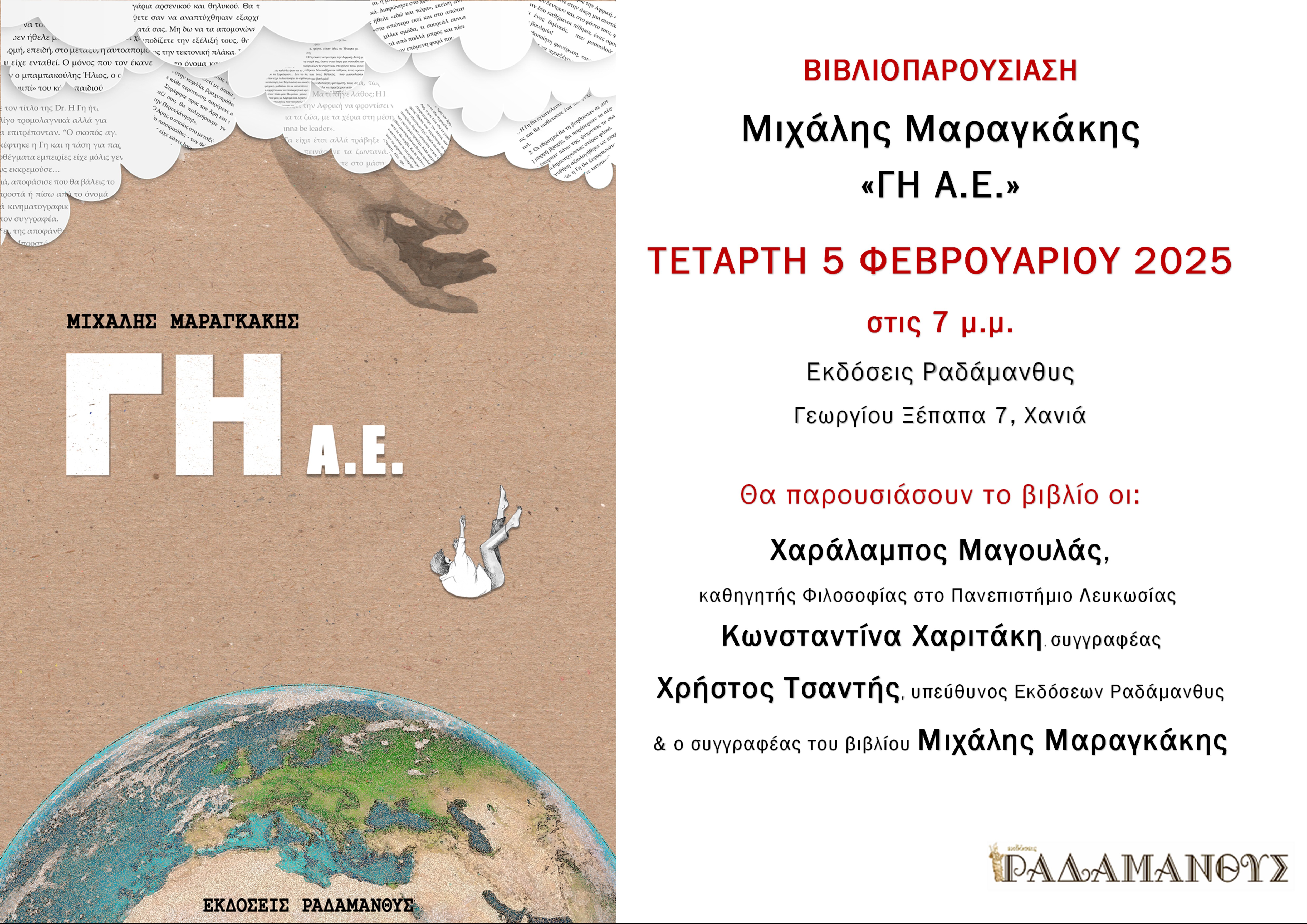 Οι Εκδόσεις Ραδάμανθυς σας προσκαλούν στην παρουσίαση του βιβλίου «Γη Α.Ε.» του Μιχάλη Μαραγκάκη, την Τετάρτη 5 Φεβρουαρίου 2025, στις 7 το απόγευμα στον χώρο των Εκδόσεων Ραδάμανθυς στα Χανιά.