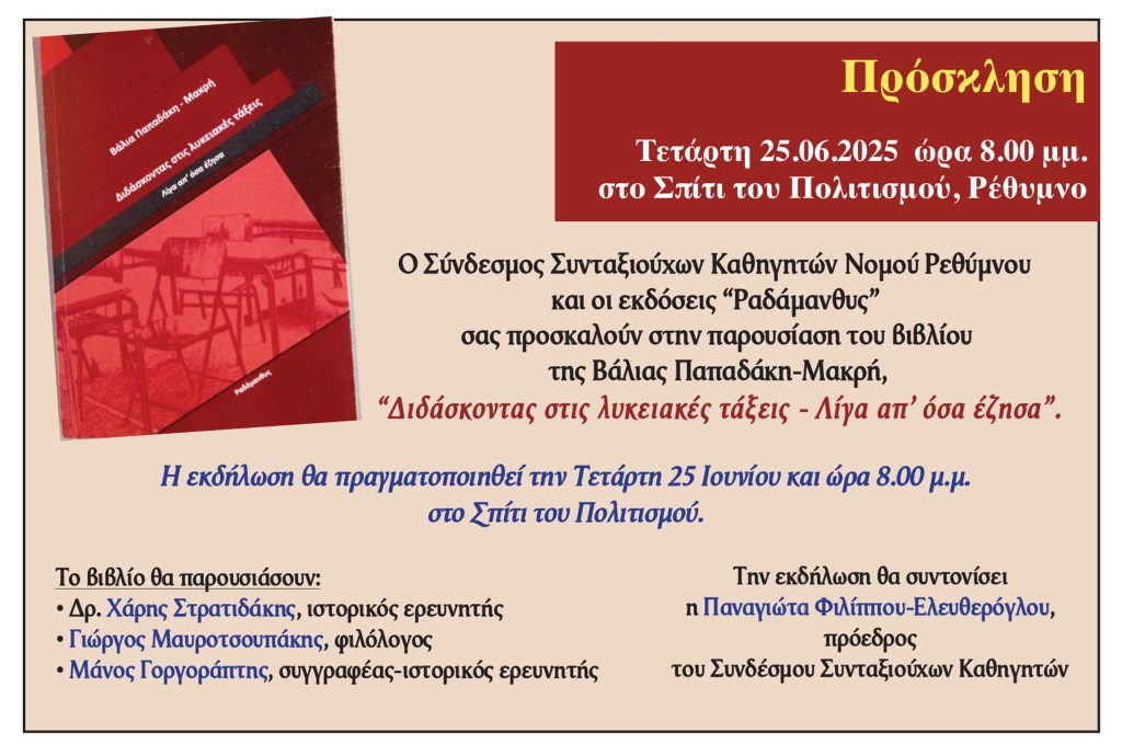 Ο Σύνδεσμος Συνταξιούχων καθηγητών Νομού Ρεθύμνου και οι Εκδόσεις Ραδάμανθυς παρουσιάσανε το βιβλίο της Βάλιας Παπαδάκη-Μακρή «Διδάσκοντας στις λυκειακές τάξεις – Λίγα απ’ όσα έζησα», την Τετάρτη 25 Ιουνίου 2025, στο Σπίτι του Πολιτισμού (Ρέθυμνο). Για το βιβλίο μίλησαν οι: Δρ. Χάρης Στρατιδάκης, ιστορικός ερευνητής, Γιώργος Μαυροτσουπάκης, φιλόλογος, Μάνος Γοργοράπτης, συγγραφέας και ιστορικός ερευνητής, και η συγγραφέας του βιβλίου. Συντόνισε η Παναγιώτα Φιλλίπου-Ελευθερόγλου, πρόδρος του Συνδέσμου Συνταξιούχων καθηγητών. Χαιρετισμός: Χρήστος Τσαντής, υπεύθυνος Εκδόσεων Ραδάμανθυς.