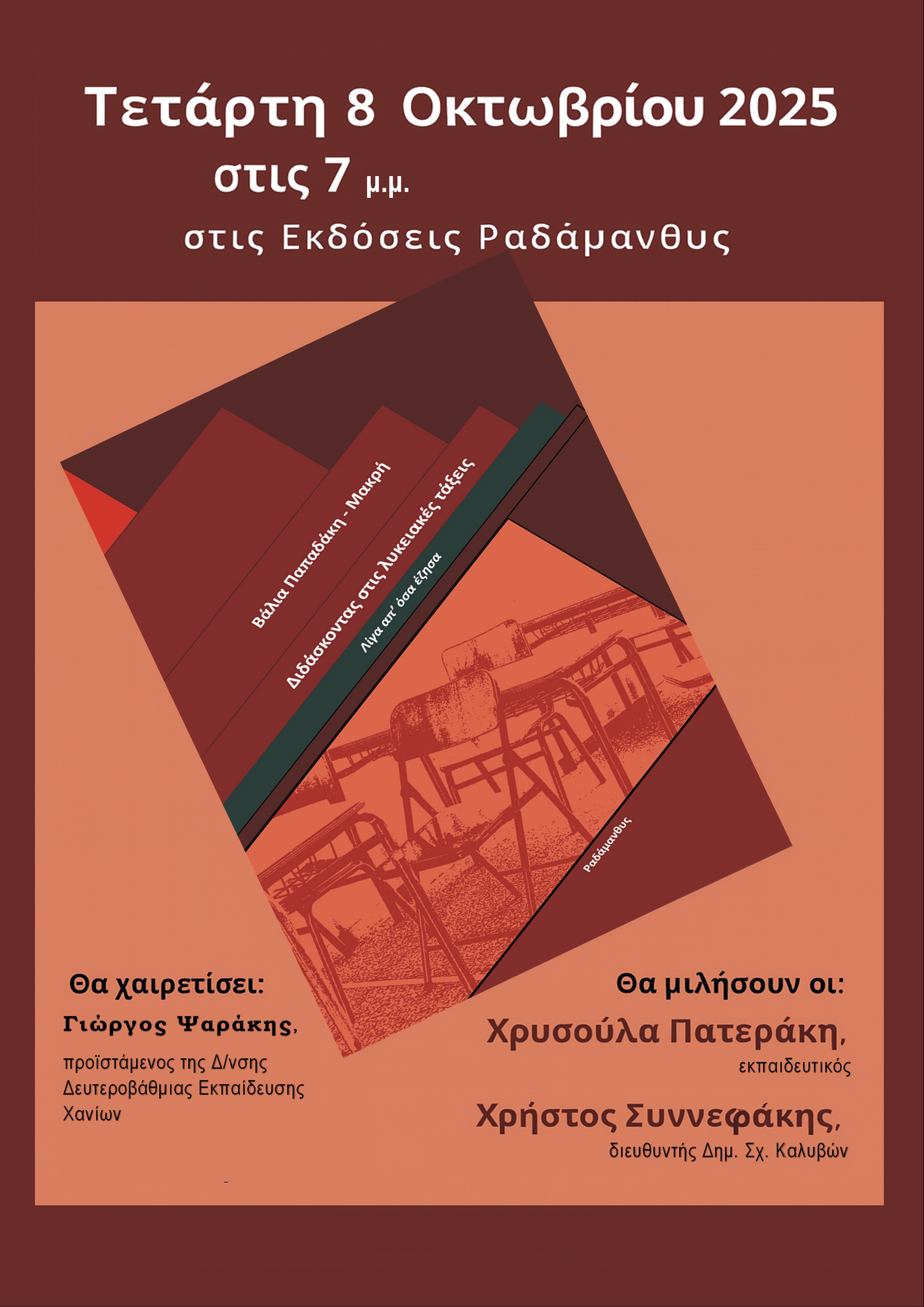 Οι Εκδόσεις Ραδάμανθυς παρουσιάζουν στα Χανιά το βιβλίο της Βάλιας Παπαδάκη Μακρή «Διδάσκοντας στις λυκειακές τάξεις – Λίγα απ’ όσα έζησα», την Τετάρτη 8 Οκτωβρίου 2025, στις 7 το απόγευμα, στον χώρο των Εκδόσεων Ραδάμανθυς (Ξέπαπα 7). Θα χαιρετίσει ο Γιώργος Ψαράκης, προϊστάμενος της Διεύθυνσης Δευτεροβάθμιας Εκπαίδευσης Χανίων. Θα μιλήσουν οι: Χρυσούλα Πατεράκη, εκπαιδευτικός, Χρήστος Συννεφάκης, διευθυντής Δημ. Σχ. Καλυβών.
