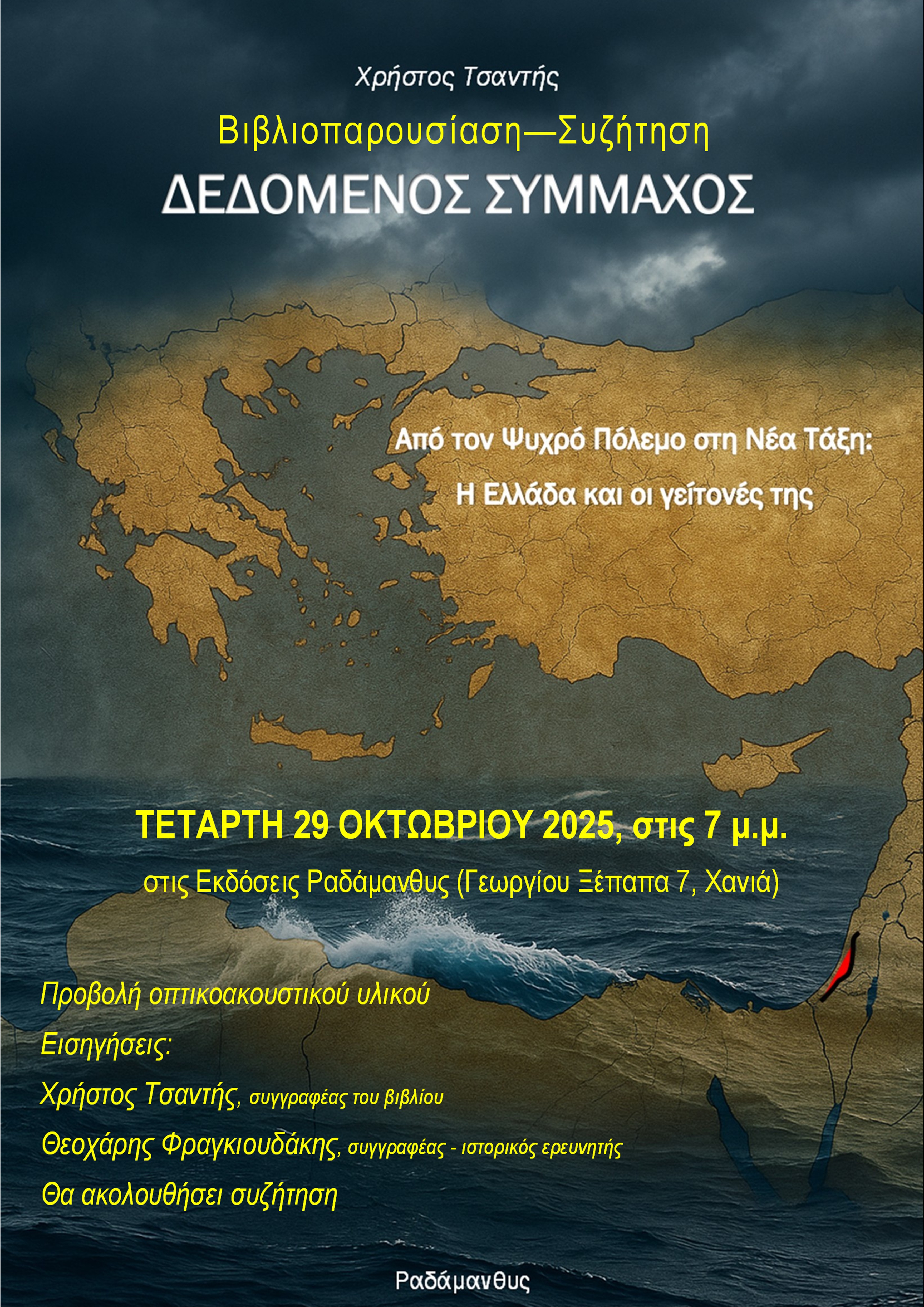 Το ιστορικό δοκίμιο του Χρήστου Τσαντή θα παρουσιάσουν οι Εκδόσεις Ραδάμανθυς την Τετάρτη 29 Οκτωβρίου 2025, στις 7 το απόγευμα, στον χώρο των εκδόσεων (Γεωργίου Ξέπαπα 7) στα Χανιά. Το βιβλίο πραγματεύεται τη στάση των ελληνικών κυβερνήσεων από τη Μεταπολίτευση και έπειτα σε σχέση με τις μεγάλες δυνάμεις και τους γείτονες, επιδιώκοντας να θέσει ερωτήματα για την πορεία των εξελίξεων στο γεωπολιτικό πεδίο και τη στάση της Ελλάδας μπροστά στις μεγάλες αλλαγές που συντελούνται, την ανάδυση του πολυπολικού κόσμου, τη γενοκτονία των Παλαιστινίων στη Γάζα και τον συνεχιζόμενο πόλεμο της Δύσης με τη Ρωσία στο Ουκρανικό έδαφος. Όλα αυτά την ώρα που βρισκόμαστε μπροστά σε εξελίξεις που αφορούν άμεσα τα κυριαρχικά δικαιώματα της χώρας μας.