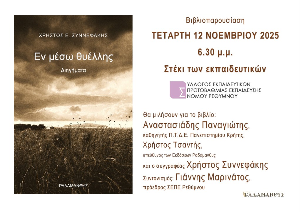Ο Σύλλογος Εκπαιδευτικών Πρωτοβάθμιας Εκπαίδευσης Νομού Ρεθύμνου και οι Εκδόσεις Ραδάμανθυς παρουσιάζουν το βιβλίο του δασκάλου Χρήστου Συννεφάκη, με τίτλο «Εν μέσω θυέλλης. Η εκδήλωση θα γίνει την Τετάρτη 12 Νοεμβρίου 2025, στις 6.30 το απόγευμα στο Στέκι των Εκπαιδευτικών (Ηλιακάκη 16, Ρέθυμνο 741 50). Θα μιλήσουν για το βιβλίο οι: