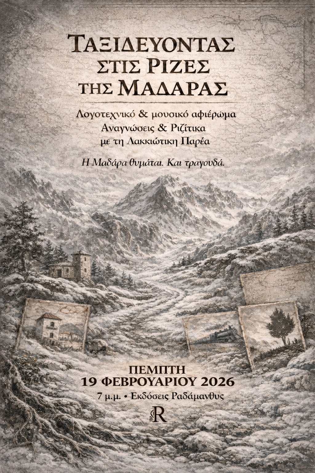 Οι Εκδόσεις Ραδάμανθυς διοργανώνουν την Πέμπτη 19 Φεβρουαρίου 2026, στις 7 μ.μ., μια ξεχωριστή πολιτιστική εκδήλωση με τίτλο: «Ταξιδεύοντας στις ρίζες της Μαδάρας», ένα λογοτεχνικό και μουσικό αφιέρωμα αφιερωμένο στη μνήμη, τον τόπο και τη φωνή της κρητικής γης. Στο επίκεντρο της βραδιάς βρίσκεται η Μαδάρα, όχι μόνο ως γεωγραφικός τόπος, αλλά ως σύμβολο ιστορίας, συλλογικής μνήμης και βιωμένης εμπειρίας. Η λογοτεχνική αφήγηση συνομιλεί με το ριζίτικο τραγούδι, δημιουργώντας μια τελετουργική εναλλαγή λόγου και μουσικής.