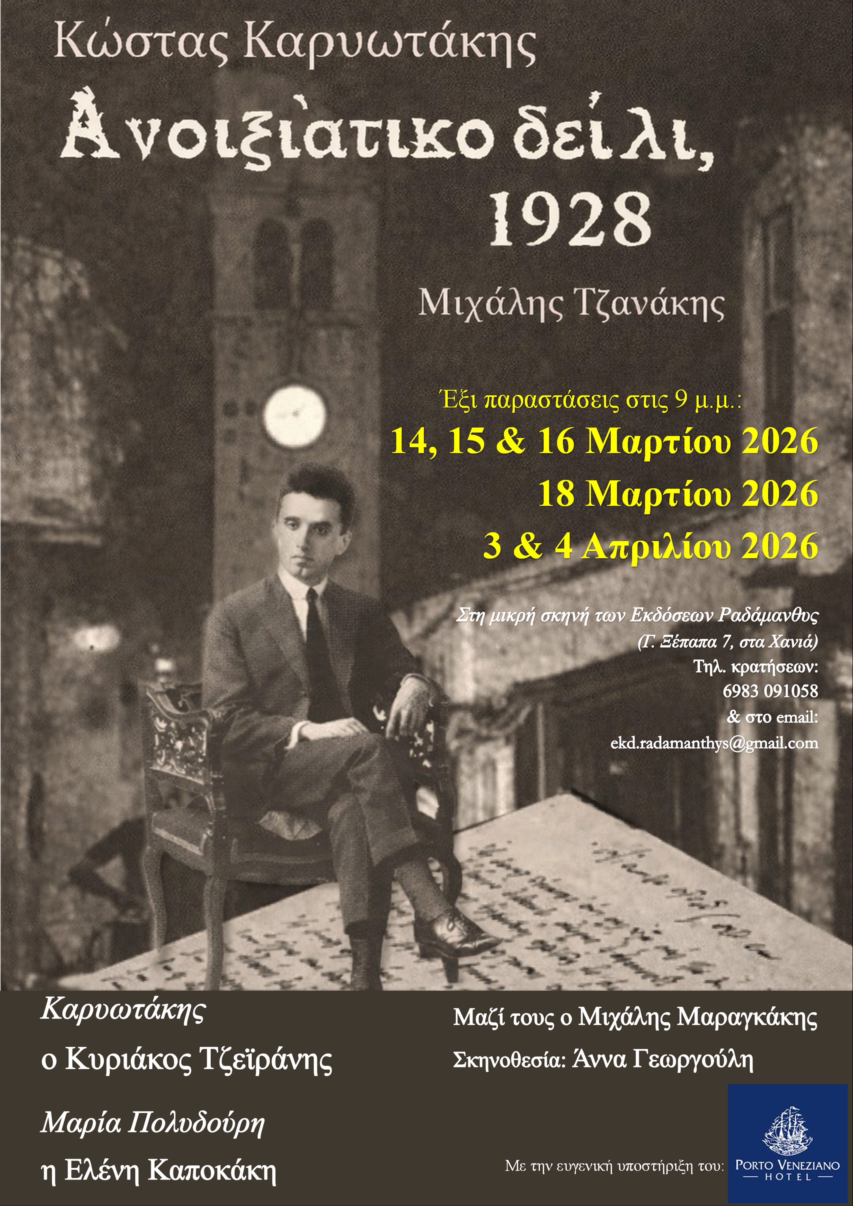 Οι Εκδόσεις Ραδάμανθυς παρουσιάζουν τη θεατρική διασκευή του βιβλίου «Κ. Καρυωτάκης – Ανοιξιάτικο Δείλι, 1928», του αειμνήστου Μιχάλη Τζανάκη, σε έναν κύκλο με έξι παραστάσεις στα Χανιά, στις 9 μ.μ.: 14, 15, 16 & 18 Μαρτίου 2026, 3 & 4 Απριλίου 2026.