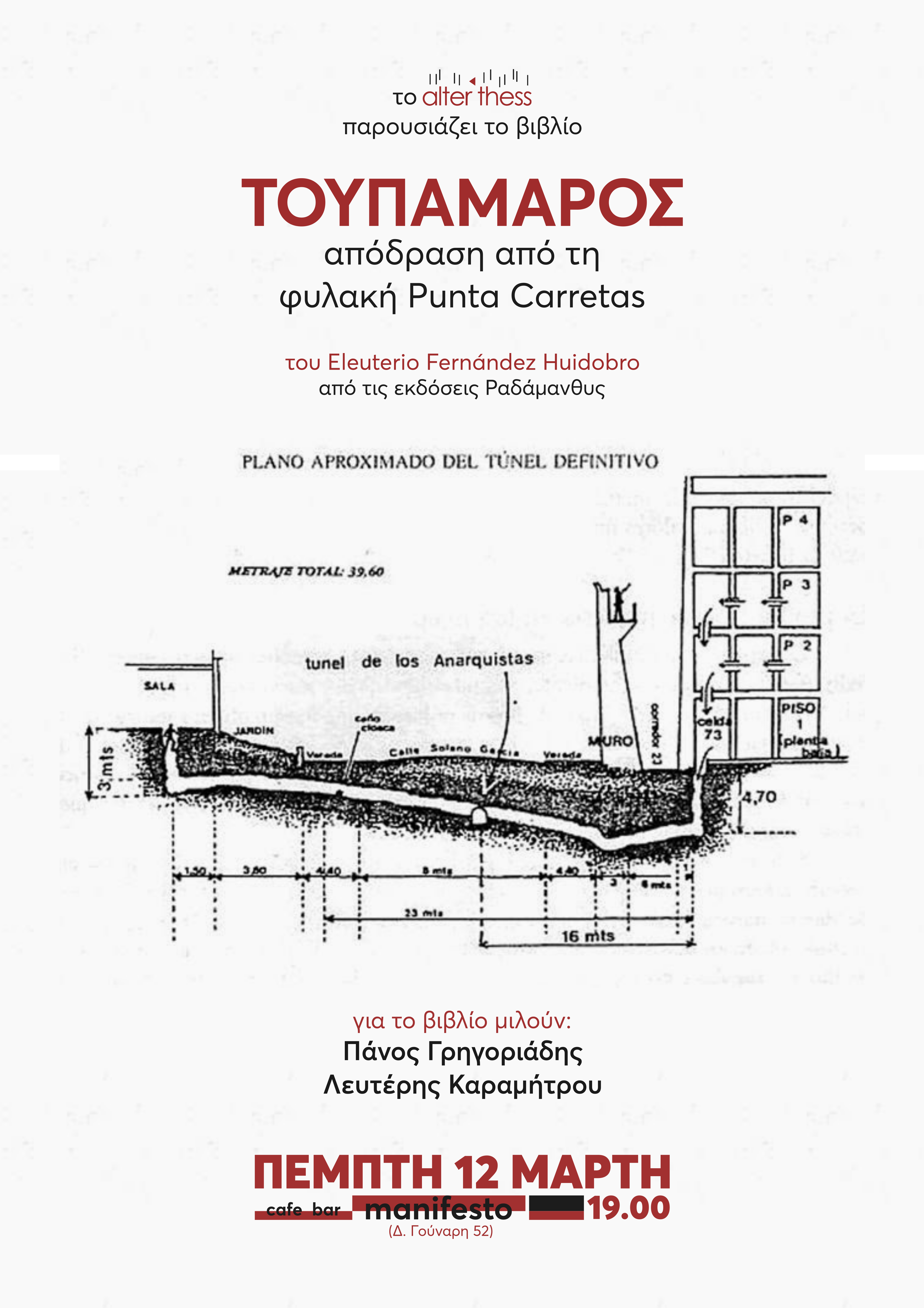 Το alter thess παρουσιάζει το βιβλίο του Eleuterio Fernández Huidobro «Τουπαμάρος – Απόδραση από τη φυλακή Punta Carretas», την Πέμπτη 12 Μαρτίου, στις 7 το απόγευμα, στο cafe bar manifesto (Δ. Γούναρη 52) στη Θεσσαλονίκη. Θα μιλήσουν για το βιβλίο οι Πάνος Γρηγοριάδης, Λευτέρης Καραμήτρου και ο μεταφραστής Δημήτρης Γωδέβενος.