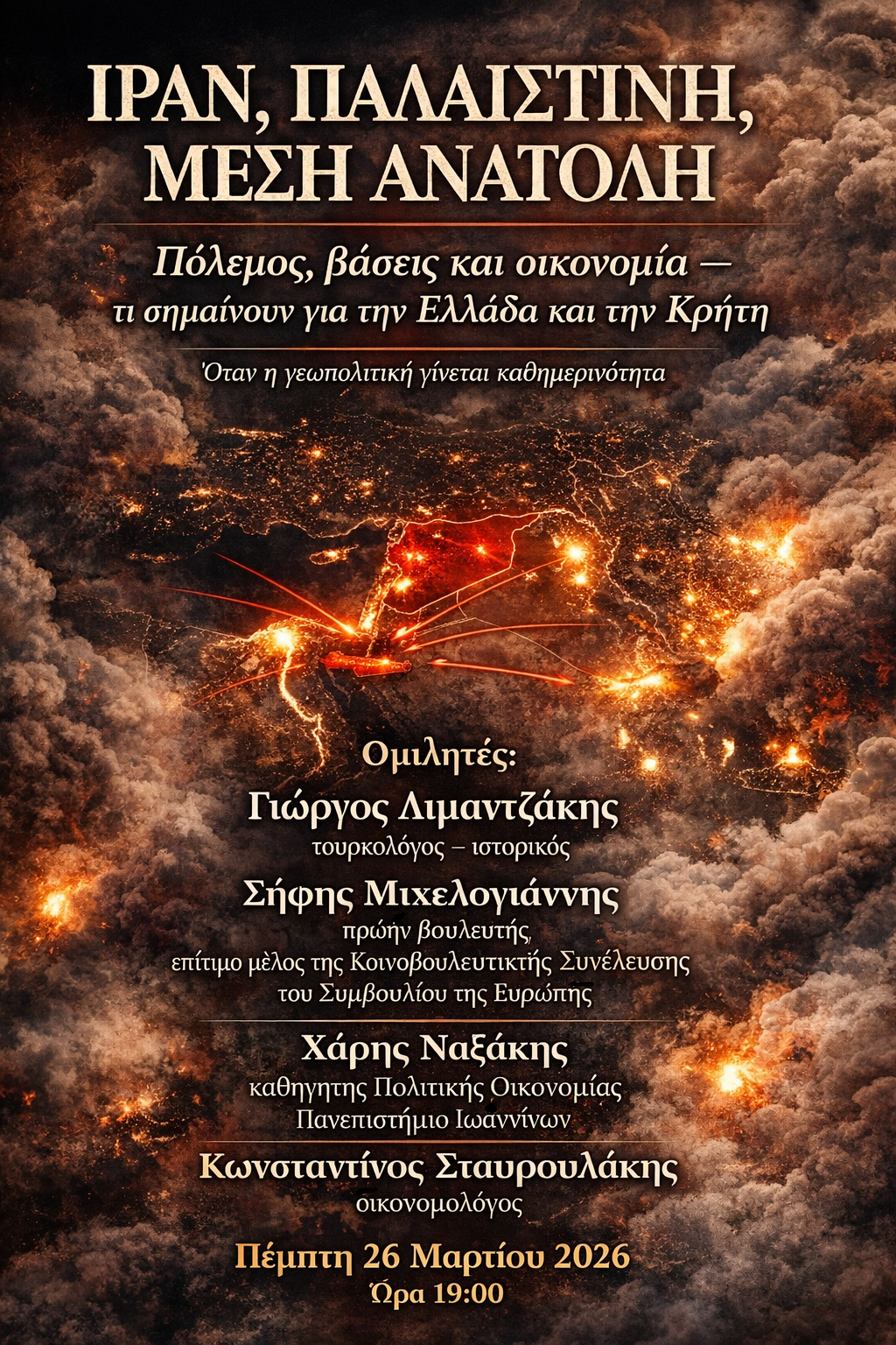 Σε μια περίοδο βαθιάς γεωπολιτικής αστάθειας και πολεμικών συγκρούσεων στη Μέση Ανατολή, τα γεγονότα ξεπερνούν τα όρια των άμεσα εμπλεκόμενων χωρών και επηρεάζουν καθοριστικά την Ευρώπη, την οικονομία και την καθημερινότητα των κοινωνιών. Την ίδια στιγμή, ο δημόσιος λόγος διαμορφώνεται συχνά μέσα από φίλτρα παραπληροφόρησης, μονομερών αφηγήσεων και επικοινωνιακής διαχείρισης της πραγματικότητας. Ζητήματα όπως η γενοκτονία και η ανθρωπιστική κρίση στην Παλαιστίνη, οι απώλειες αμάχων, η στοχοποίηση κρίσιμων υποδομών, αλλά και η αμφισβήτηση βασικών αρχών του διεθνούς δικαίου, επανέρχονται με δραματικό τρόπο στο προσκήνιο.