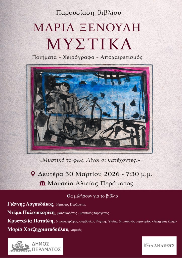 Το Πολιτιστικό Τμήμα του Δήμου Περάματος και οι Εκδόσεις Ραδάμανθυς σας προσκαλούν στην παρουσίαση του βιβλίου της Μαρίας Ξενούλη, με τίτλο «ΜΥΣΤΙΚΑ – Ποιήματα, Χειρόγραφα, Αποχαιρετισμός», τη Δευτέρα 30 Μαρτίου 2026, στις 7:30 μ.μ., στο Μουσείο Αλιείας Περάματος, στο πλαίσιο της αναδρομικής έκθεσης ζωγραφικής της Μαρίας Ξενούλη, η οποία ξεκινά την ίδια ημέρα και θα διαρκέσει έως και την 1η Απριλίου.