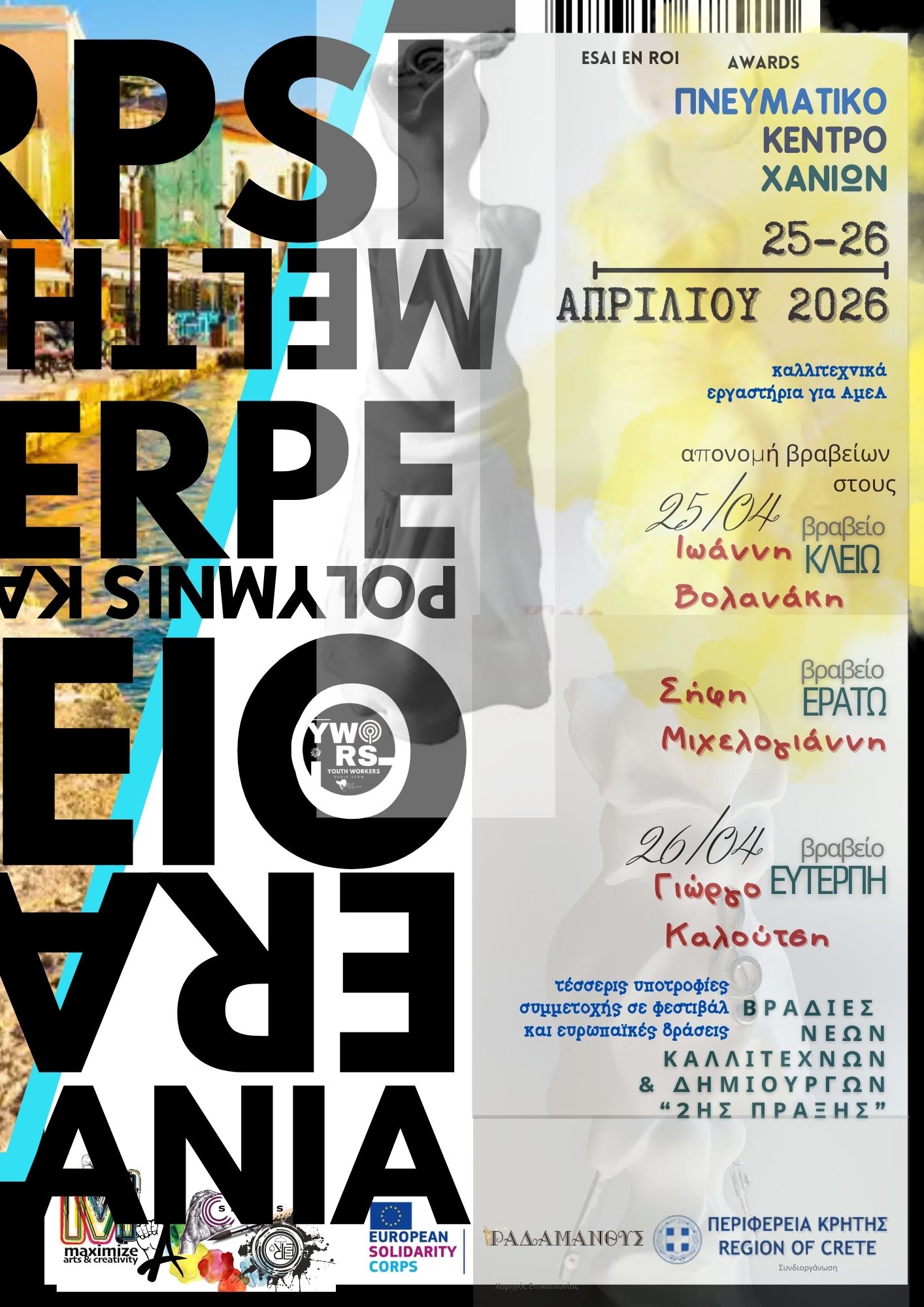 Στο πλαίσιο της Ευρωπαϊκής Εβδομάδας Νεολαίας, θα πραγματοποιηθούν στα Χανιά οι Δράσεις Καλλιτεχνικής Παιδείας «Μουσών Καινοπραγία», ένα διήμερο αφιερωμένο στην τέχνη, τη δημιουργικότητα και τη συμπερίληψη, στις 25 και 26 Απριλίου 2026, στο Πνευματικό Κέντρο Χανίων.
