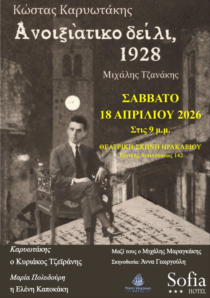 Οι Εκδόσεις Ραδάμανθυς παρουσιάζουν τη θεατρική διασκευή του βιβλίου «Κ. Καρυωτάκης – Ανοιξιάτικο Δείλι, 1928», του αείμνηστου Μιχάλη Τζανάκη, το Σάββατο 18 Απριλίου 2026, στη Θεατρική Σκηνή Ηρακλείου