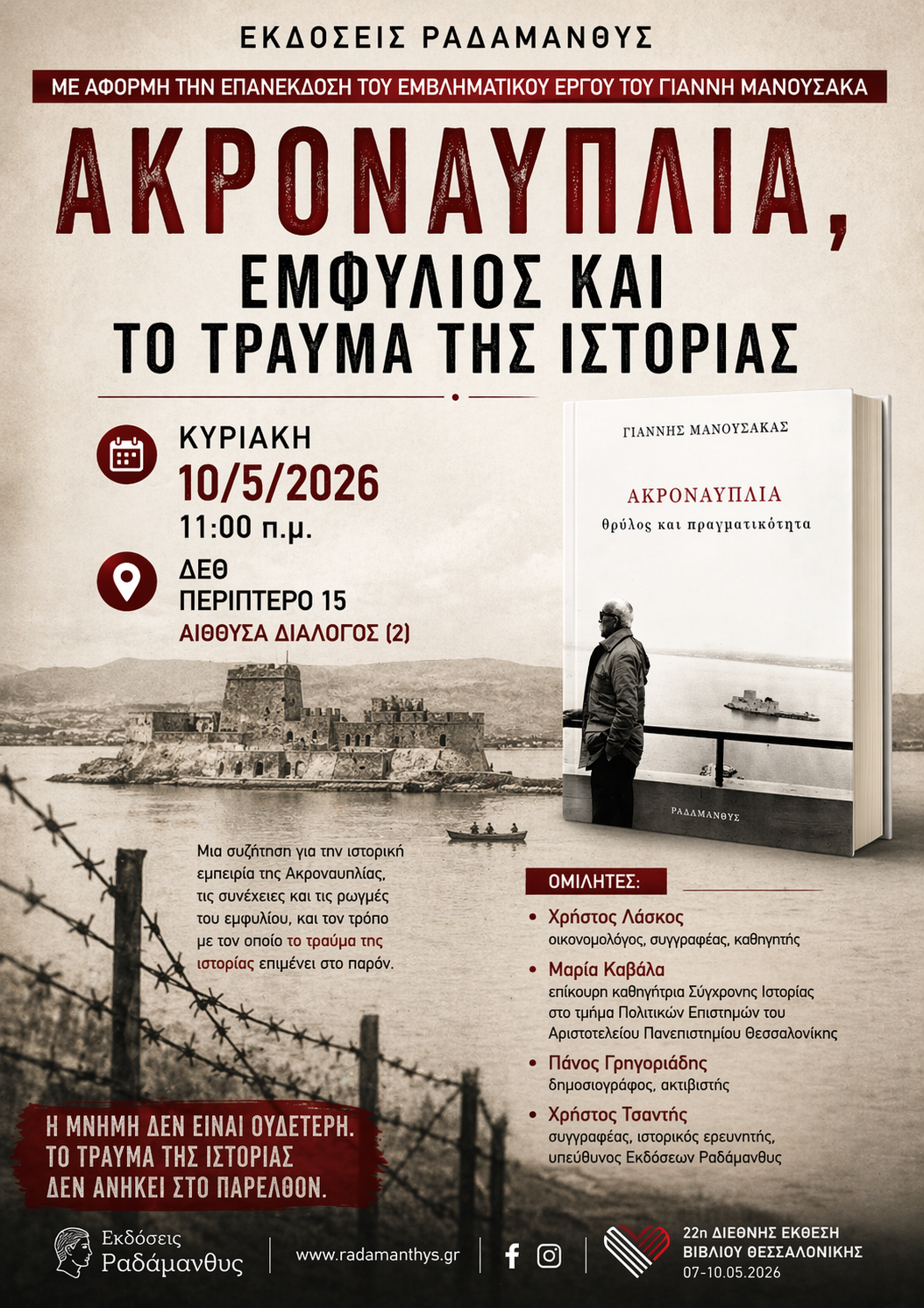 Με αφορμή την επανέκδοση του εμβληματικού έργου του Γιάννη Μανούσακα «Ακροναυπλία», οι Εκδόσεις Ραδάμανθυς διοργανώνουν μια εκδήλωση που υπερβαίνει τα όρια της κλασικής βιβλιοπαρουσίασης και ανοίγει έναν δημόσιο διάλογο γύρω από τη μνήμη, την Ιστορία και το ανεπούλωτο τραύμα του εμφυλίου.