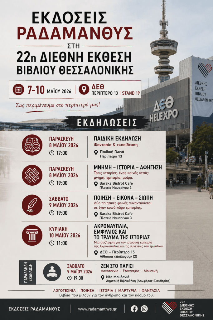 Οι Εκδόσεις Ραδάμανθυς συμμετέχουν στη 22η Διεθνή Έκθεση Βιβλίου Θεσσαλονίκης, συνεχίζοντας την πορεία τους ως ένας ανεξάρτητος εκδοτικός χώρος που δίνει βήμα σε σύγχρονες, βιωματικές και εναλλακτικές φωνές της λογοτεχνίας και της σκέψης.