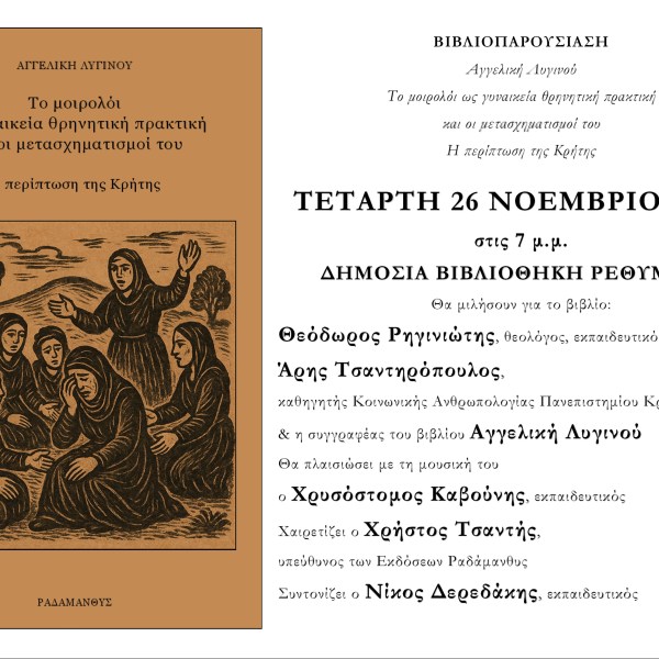 από Ραδάμανθυς - Εκδόσεις, Πολυχώρος, Εργαστήρια Δημοσιεύθηκε την 16/11/202517/11/2025 Αγγελική Λυγινού «Το μοιρολόι ως γυναικεία θρηνητική πρακτική και οι μετασχηματισμοί του – Η περίπτωση της Κρήτης» – Βιβλιοπαρουσίαση στο Ρέθυμνο Ανάγνωση του υπολοίπου