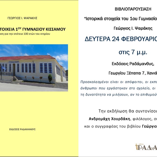 από Ραδάμανθυς - Εκδόσεις, Πολυχώρος, Εργαστήρια Δημοσιεύθηκε την 15/02/202516/02/2025 Βιβλιοπαρουσίαση: «Ιστορικά στοιχεία του 1ου Γυμνασίου Κισσάμου» Ανάγνωση του υπολοίπου