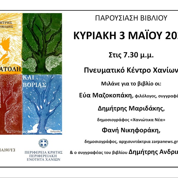 από Ραδάμανθυς - Εκδόσεις, Πολυχώρος, Εργαστήρια Δημοσιεύθηκε την 21/04/2026 Δημήτρης Ανδρικίδης «Ανατολή και Βοριάς – Βιβλιοπαρουσίαση στα Χανιά Ανάγνωση του υπολοίπου