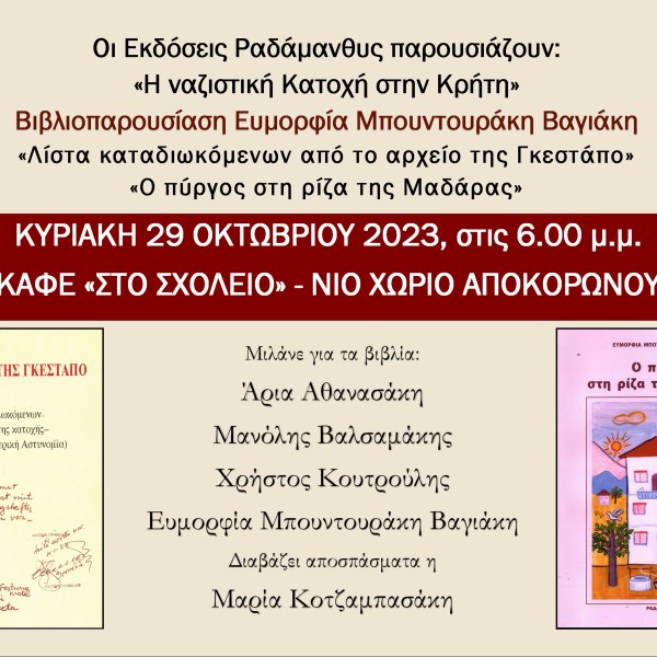 από Ραδάμανθυς - Εκδόσεις, Πολυχώρος, Εργαστήρια Δημοσιεύθηκε την 22/03/2024 Βιβλιοπαρουσίαση στην Αθήνα: Ευμορφία Μπουντουράκη Βαγιάκη «Ο Πύργος στη ρίζα της Μαδάρας» Ανάγνωση του υπολοίπου
