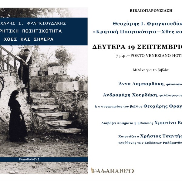 από Ραδάμανθυς - Εκδόσεις, Πολυχώρος, Εργαστήρια Δημοσιεύθηκε την 13/09/2022 Θεοχάρης Φραγκιουδάκης «Κρητική Ποιητικότητα» – Βιβλιοπαρουσίαση Ανάγνωση του υπολοίπου
