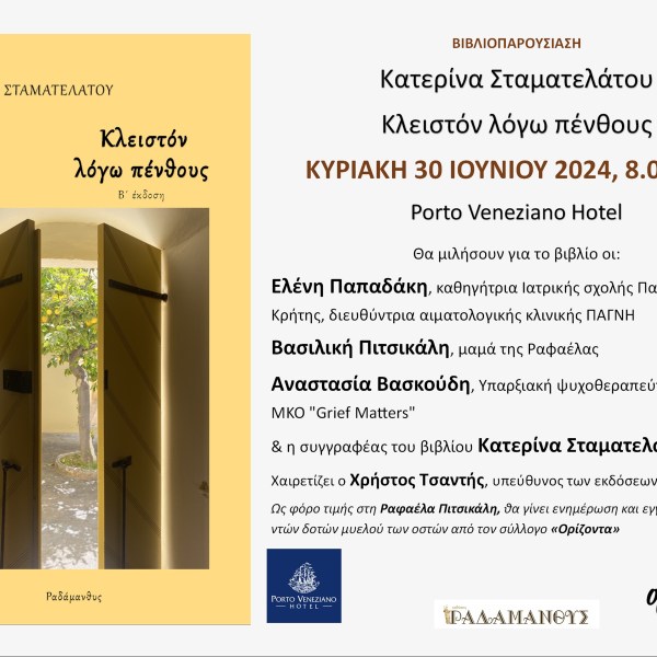 από Ραδάμανθυς - Εκδόσεις, Πολυχώρος, Εργαστήρια Δημοσιεύθηκε την 06/06/2023 Κατερίνα Σταματελάτου «Κλειστόν λόγω πένθους» – Βιβλιοπαρουσίαση στη Σητεία Ανάγνωση του υπολοίπου