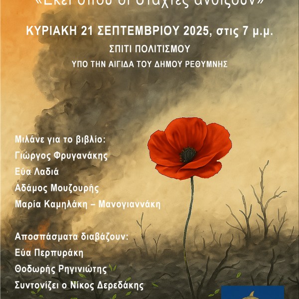 από Ραδάμανθυς - Εκδόσεις, Πολυχώρος, Εργαστήρια Δημοσιεύθηκε την 19/08/202519/08/2025 Βιβλιοπαρουσίαση στα Χανιά – Μαρία Καμηλάκη Μανογιαννάκη «Εκεί όπου οι στάχτες ανθίζουν» Ανάγνωση του υπολοίπου